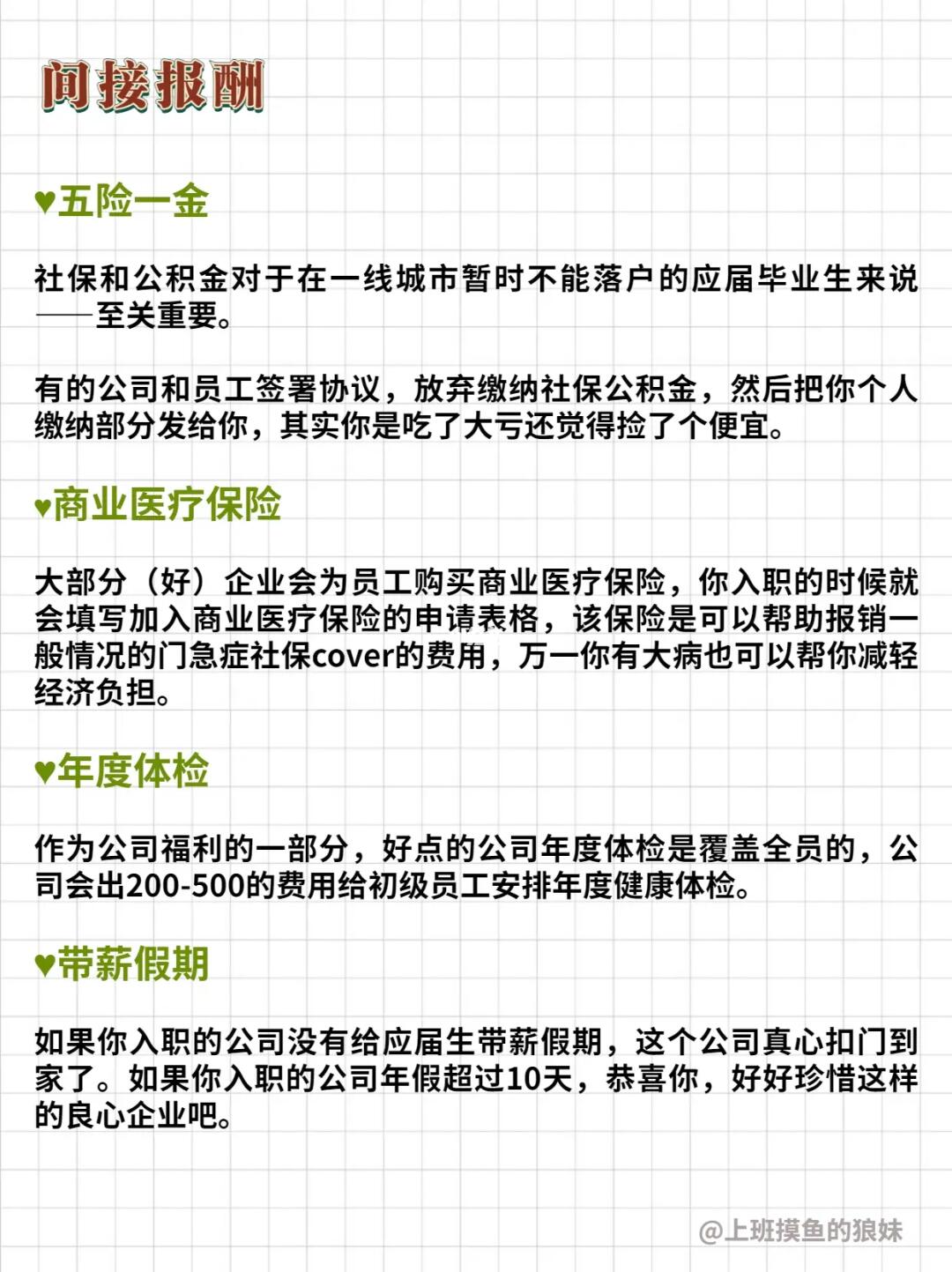 比如商业医疗保险、是不是管三餐、有没有年度体检、带薪年假有几天?这些证明了公司实力也是帮你省了一大笔钱