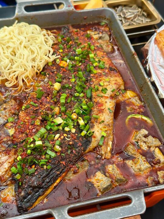 ✅沸腾烤鱼:烤鱼份量真的很足!!鱼肉外焦里嫩!麻辣味巴适惨了!!!而且炒鸡入味!!!