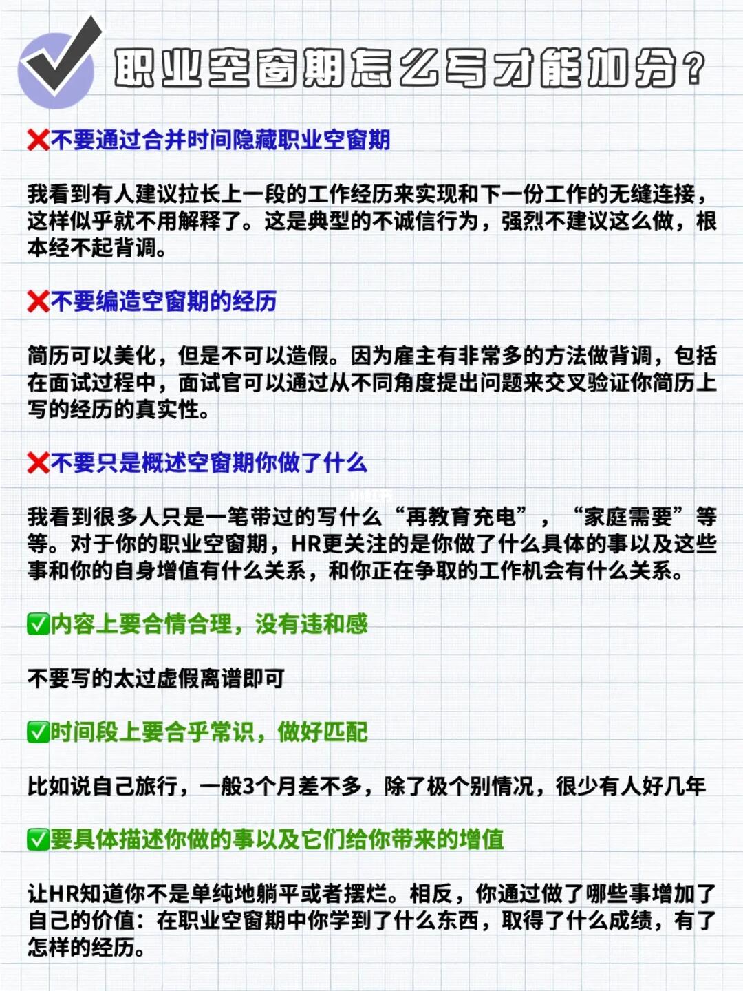 3⃣️不要:不要通过合并时间隐藏职业空窗期、不要编造空窗期经历、不要只是一句话概述空窗期做了什么