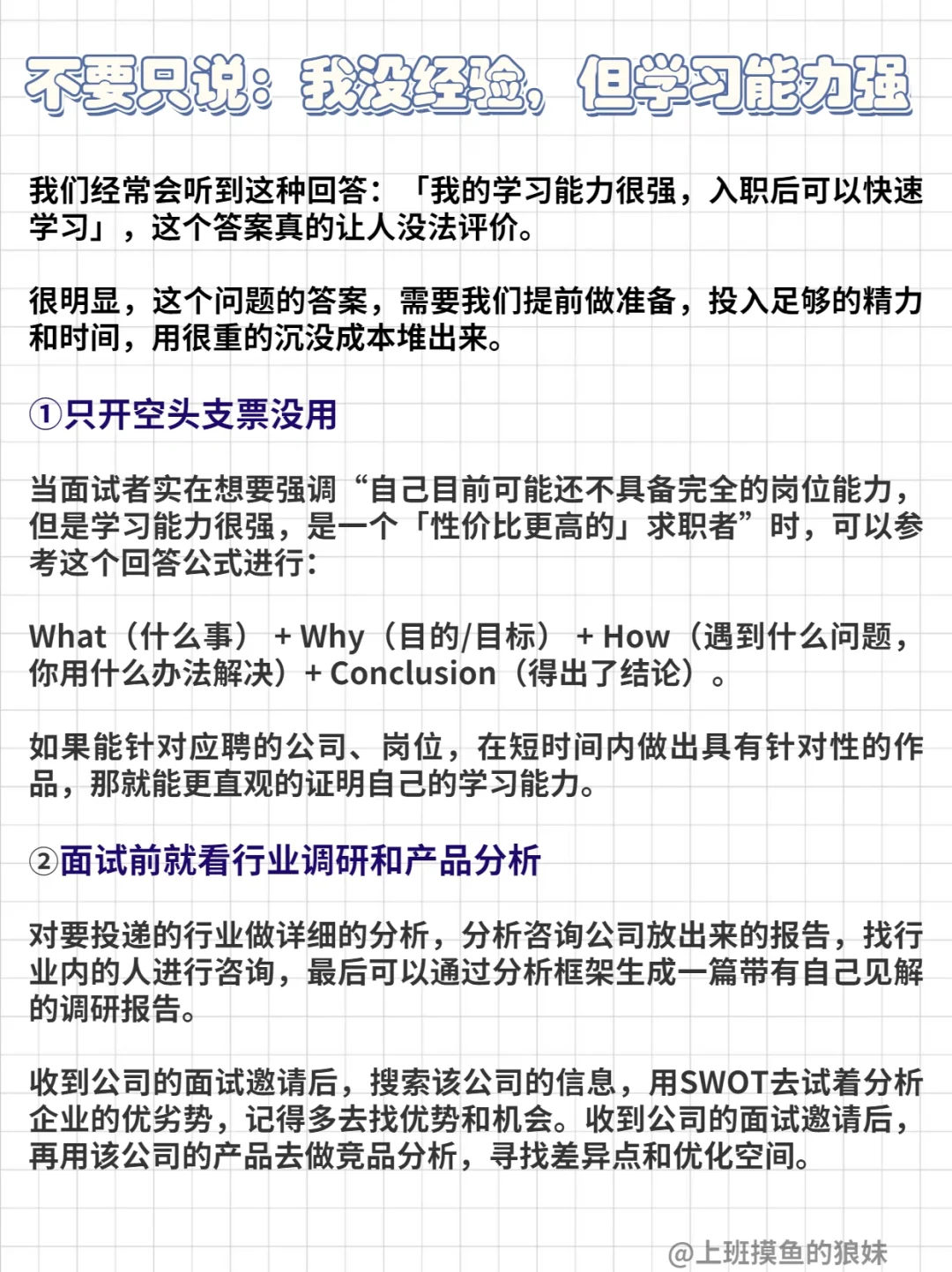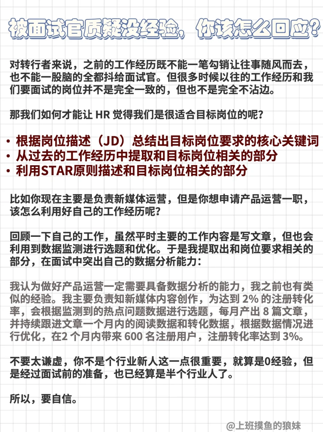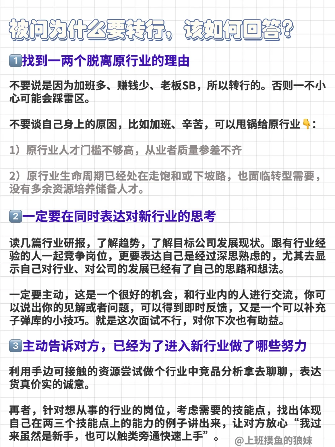 不少姐妹问我,想转行了怎么办?面试官总是问我为什么想转行,我总是说不好。 因为一旦跨行,面试官心里肯定会嘀咕两件事: 👀你为什么放弃了以前的行业? 👀行业经验偏少,你真的是合适人选嘛? 单从问题看,其实我们可以从以下三个方面去回答: 💚找出原行业一两个不得不离开的原因 💜表达自己对新行业的思考 💛主动告诉对方你为进入新行业做了什么准备 除此之外,你不得不面对面试官的质疑:你没有经验,我为什么要你? 狼妹为你总结了应对方案,以及面试前应该做的准备🙌🙌🙌