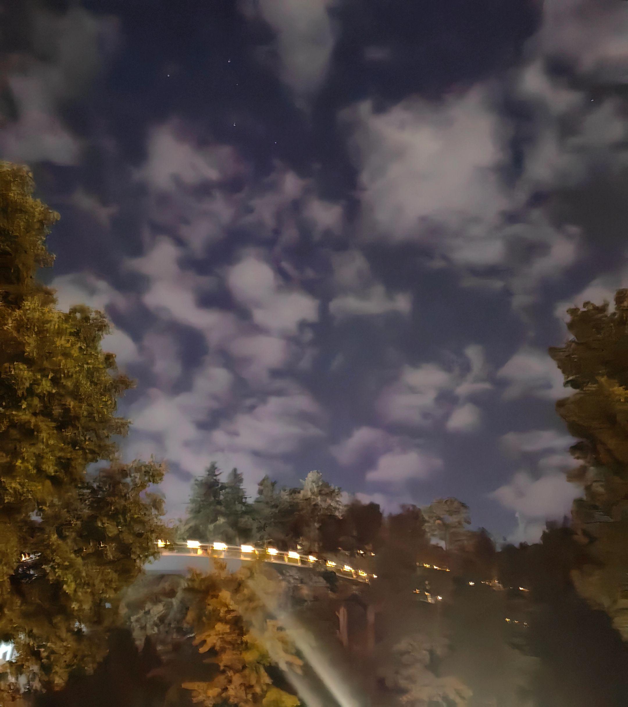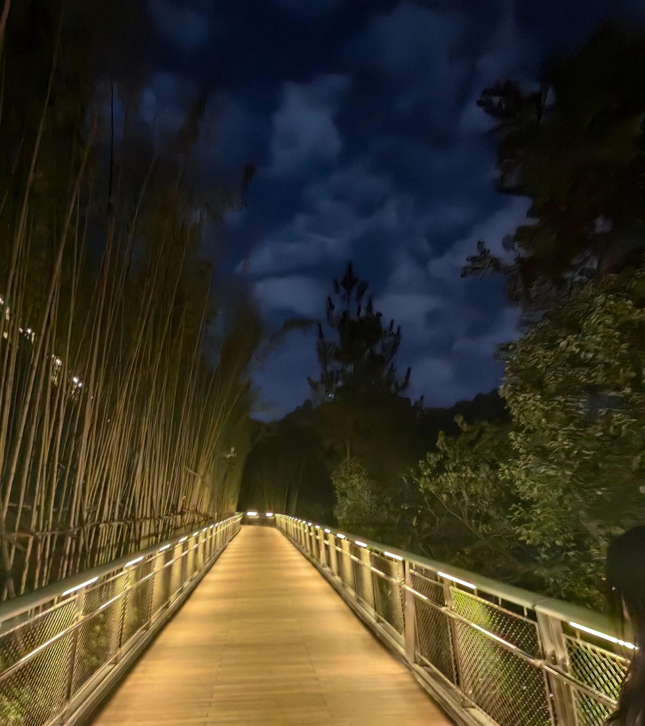 环约五六周,其末见步道悬空,直接山壁。行至栈桥,沥青化木,翠竹夹道,行人交接。蜒折数十里,转入山间,峰峦蔽天,直插其中。愕然,复向前行,过一甬道,天云顿开。