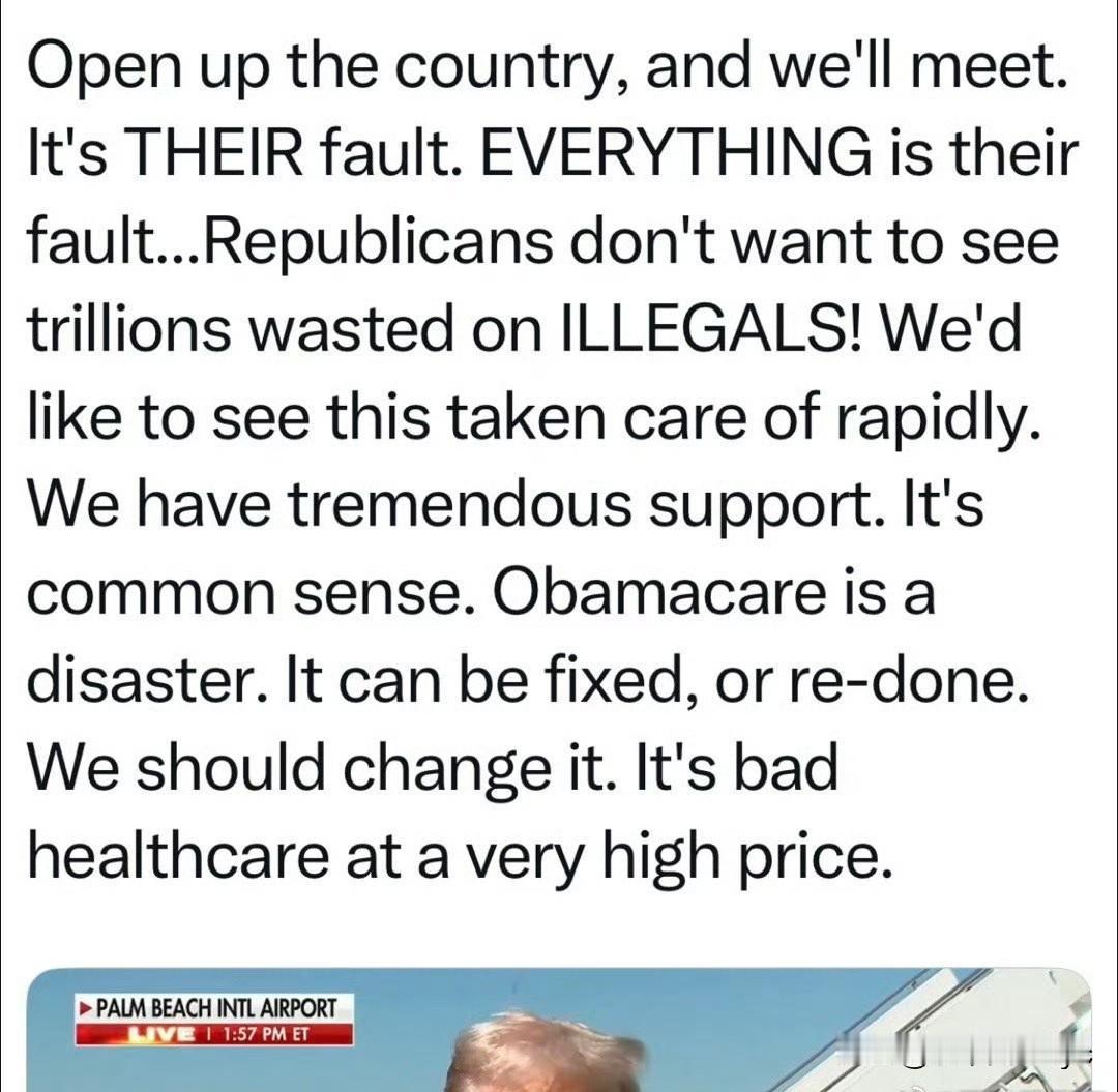 政府关门第32天,特朗普发表评论:先重新开门、然后再讨论…这是他们的错、一切都是他们的错…我们不想花钱给非法移民…奥巴马医保是灾难,得修改、或推翻 特朗普的此番言论,有自己的策略和意图—— 他强调“我们不想花钱给非法移民”,这与他在美墨边境修建隔离墙的核心竞选承诺紧密相连。修建边境墙是特朗普“美国优先”和强硬移民政策的标志性主张。 巩固反建制的形象,将“奥巴马医保”称为“灾难”并呼吁修改或推翻,迎合了其支持者对现有医疗体系的不满,强化其挑战旧有政治秩序的定位。 集中体现了他善于设定议程、将自身塑造为传统政治挑战者,并将政治对立与矛盾公开化、尖锐化的特点。 他通过直接且富有情绪化的表达,稳固其基本盘支持,但同时也可能加剧美国国内的政治极化与社会分歧。 但是他说法推翻奥巴马的医保政策可能吗?Obamacare出台至今,众议院投票70次、参议院投票15次,各种形式或途径,都没成功。