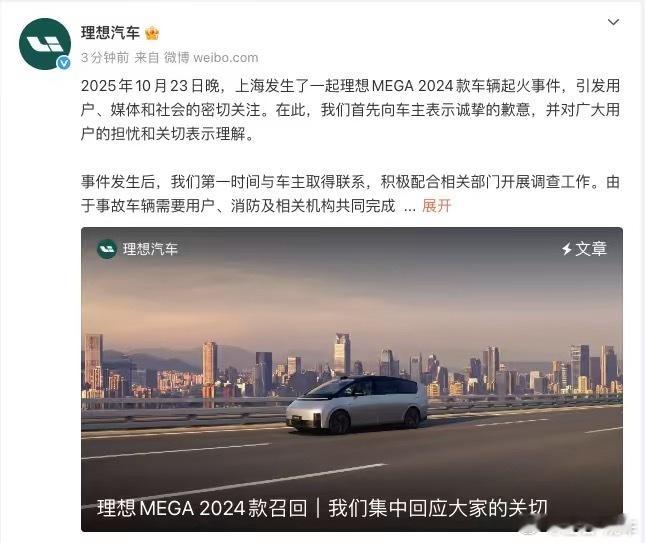 左右观车【北京理想汽车有限公司召回部分理想MEGA 2024款电动汽车】日前,北京理想汽车有限公司根据《缺陷汽车产品召回管理条例》和《缺陷汽车产品召回管理条例实施办法》的要求,主动向国家市场监督管理总局备案了召回计划。召回编号S2025M0174V:自2025年11月7日起,召回生产日期从2024年2月18日至2024年12月27日的理想MEGA 2024款汽车,共计11411辆。