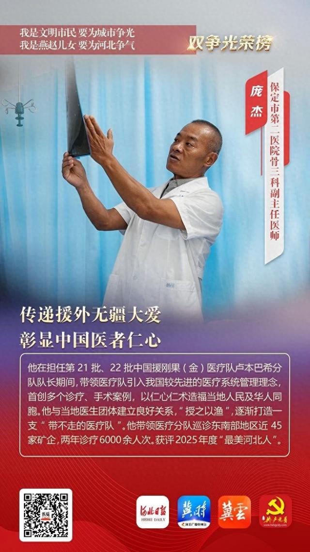 他在担任第21批、22批中国援刚果(金)医疗队卢本巴希分队队长期间,带领医疗队引入我国较先进的医疗系统管理理念,首创多个诊疗、手术案例,以仁心仁术造福当地人民及华人同胞。他与当地医生团体建立良好关系,“授之以渔”,逐渐打造一支“带不走的医疗队”。他带领医疗分队巡诊东南部地区近45家矿企,两年诊疗6000余人次。获评2025年度“最美河北人”。