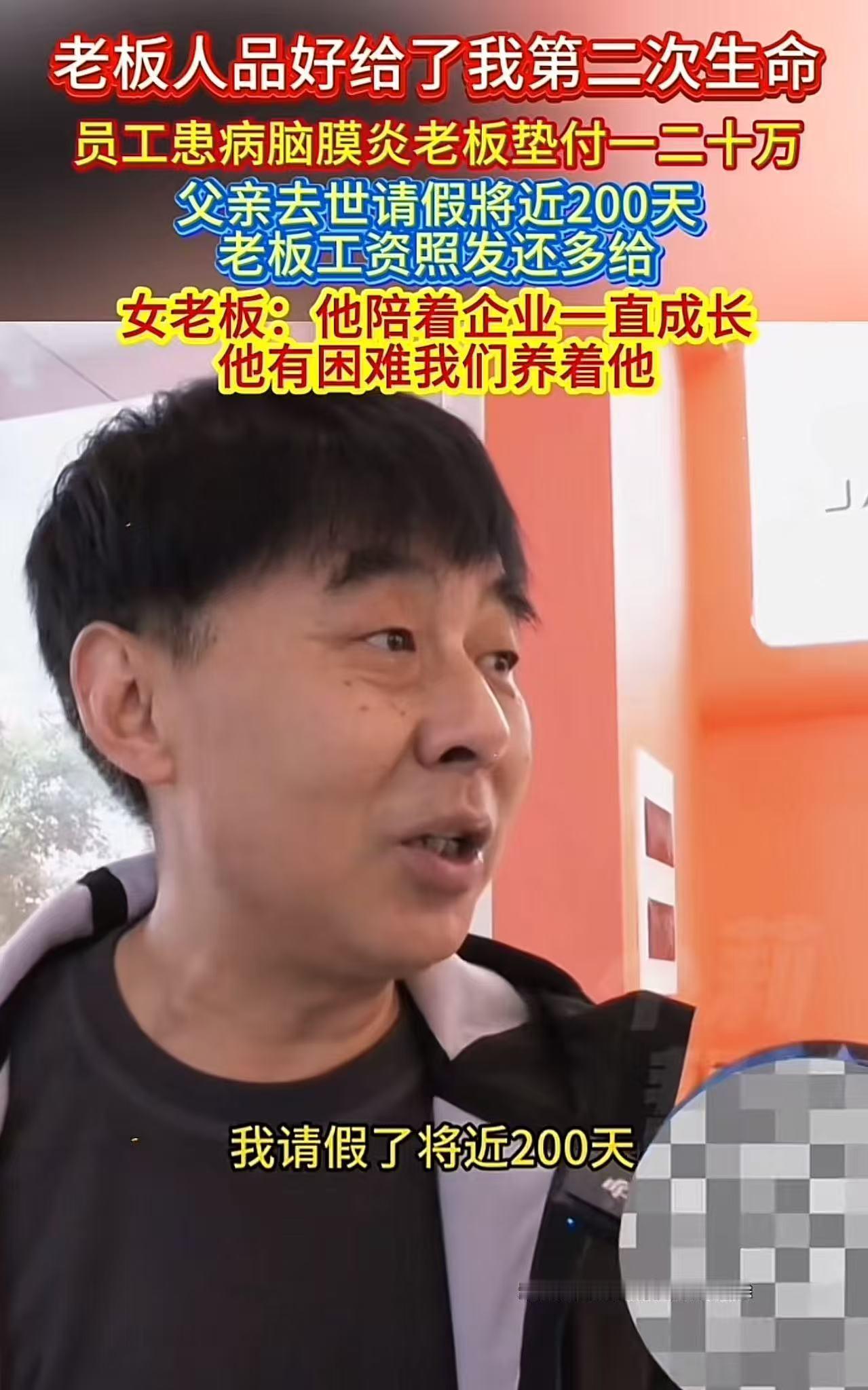 员工父亲生病去世,请假200多天,老板不仅没有开除他,还工资照发!后来员工得了脑膜炎,老板还主动垫付了一二十万医药费! 麻烦各位读者点一下右上角的“关注”,留下您的精彩评论与大家一同探讨,感谢您的强烈支持! 你有没有见过这样的企业?员工遇到人生至暗时刻,老板却选择与他共渡难关,不离不弃。最近,一则工厂女老板“善待老员工”的故事,在网络上引起了不少共鸣。 故事的主角,是一家睡衣厂的普通工人王升,他和老板之间的信任与守护,像一颗火种,让冷清的职场多了点温度。 王升年过半百,和许多工厂工人一样,人生并不算顺遂。他从年轻时就进入了这家睡衣厂,一干就是二十多年。 对于他来说,工厂不仅是谋生的地方,更是陪伴他成长的另一“家”。可生活总有意外。2005年,王升的父亲突然患重病,照顾家人和工作的责任一下子压在了他肩上。那时的他,几乎每天都在医院和家里两头跑,精疲力竭。 很多人都明白,普通打工者如果长期缺勤,往往面临失业危机。王升也不例外,心里惴惴不安。本以为请假几个月,老板多半会选择另聘新人,自己可能就要被工厂“刷掉”。 可现实出人意料。老板没有一句责备,工资照发,甚至还多给了点补贴。对于当时的王升来说,这份理解无疑是雪中送炭,也让他下定决心“把工厂当成自己的家”,用全部精力回报企业。 本以为日子会这样平稳过去,没想到十几年后,王升又遭遇了更大的风浪。2017年,他突发脑膜炎,高烧不退,几乎丧失意识。 住院期间,医生下了病危通知书。家里人为了筹医药费四处奔走,钱如流水般花出去,仍然远远不够。这时,老板再一次伸出了援手。 她没有犹豫,直接提出:医院说能治就治,所有费用她负责垫付。最后,前前后后花了一二十万,这对于普通企业来说绝不是小数目。老板却始终没有催促,也没有抱怨,只关心一句“人能救回来最重要”。 王升的康复,不仅仅是医学的奇迹,更是这份信任和善意带来的结果。出院那天,他忍不住掉下眼泪,觉得自己遇上了“贵人”。 而老板的想法很简单:“员工陪企业一起成长,企业也要撑员工一把。”在她看来,这不是“施舍”,而是对共同奋斗的回报,是企业责任的应有之义。 这个故事之所以让很多人感慨,不仅是因为老板的慷慨和善良,更是那种“你有难,我挺你”的情谊,在快节奏、讲效率的今天,实在难得。 现实中,我们见惯了“以利为先”,员工生病就辞退、遇事就推脱的不在少数。可一旦有了温度,企业就能成为真正意义上的“靠山”。 评论区有网友说,自己曾遇到过同样的暖心老板,也有不少人直言“遇上冷漠管理,只能自认倒霉”。其实,无论你是老板还是员工,都希望能遇到彼此信任、相互成全的搭档。毕竟,企业和员工是彼此成就的关系,谁也不可能独善其身。 在这个故事背后,我们看到的,不只是一次次雪中送炭,更是一种长久关系的回馈。谁都知道,“铁打的营盘,流水的兵”,但有些企业之所以能走得长远,并不是因为利润有多高,而是因为在关键时刻,有人为你兜底。 你怎么看这样的企业呢?