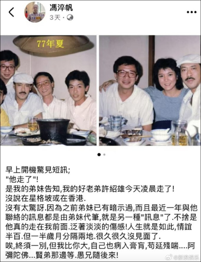 2025年10月28日,他还在发文悼念刚去世的好友许绍雄,感叹“贤弟那边等,愚兄随后来”。