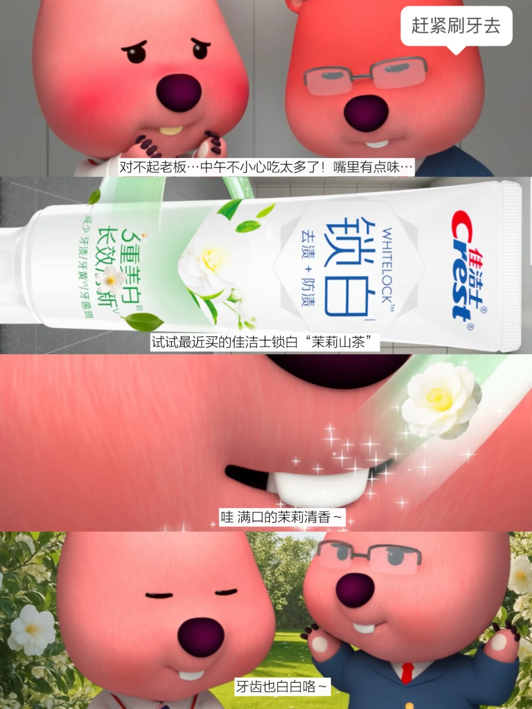 救命!前一秒刚收到佳洁士快递,后一秒就刷到了loopy联名小短片!也太太太萌了吧!电梯偶遇领导想开口say hi却被紧急闭麦!小小门牙一下暴露中午刚下肚的火锅奶茶,口味重到露比脚趾抠出三室一厅......只好火速拿出佳洁士锁白牙膏来救场,挽回loopy本萌专业又靠谱的形象在此一举!