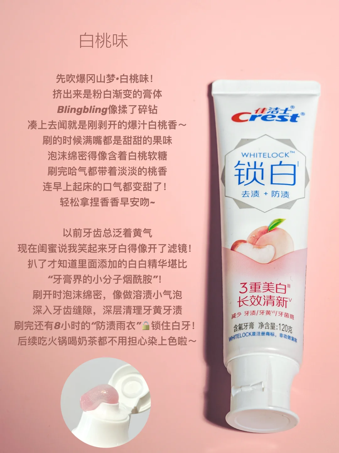 我最喜欢白桃味,一入口直接惊到——就是爆汁白桃软糖在嘴里化开的感觉!绵密的泡沫带着清甜果香,刷完哈气都像喷了淡香水!连打哈欠都敢大方露齿~关键是美白真的顶!我这种咖啡星人+重辣爱好者,以前牙齿总泛着黄气,现在闺蜜说我笑起来牙白得像开了滤镜!扒了才知道里面添加的白白精华堪比“牙膏界的小分子烟酰胺”!刷开时泡沫绵密,像做溶渍小气泡~深入牙齿缝隙,深层清理牙黄牙渍