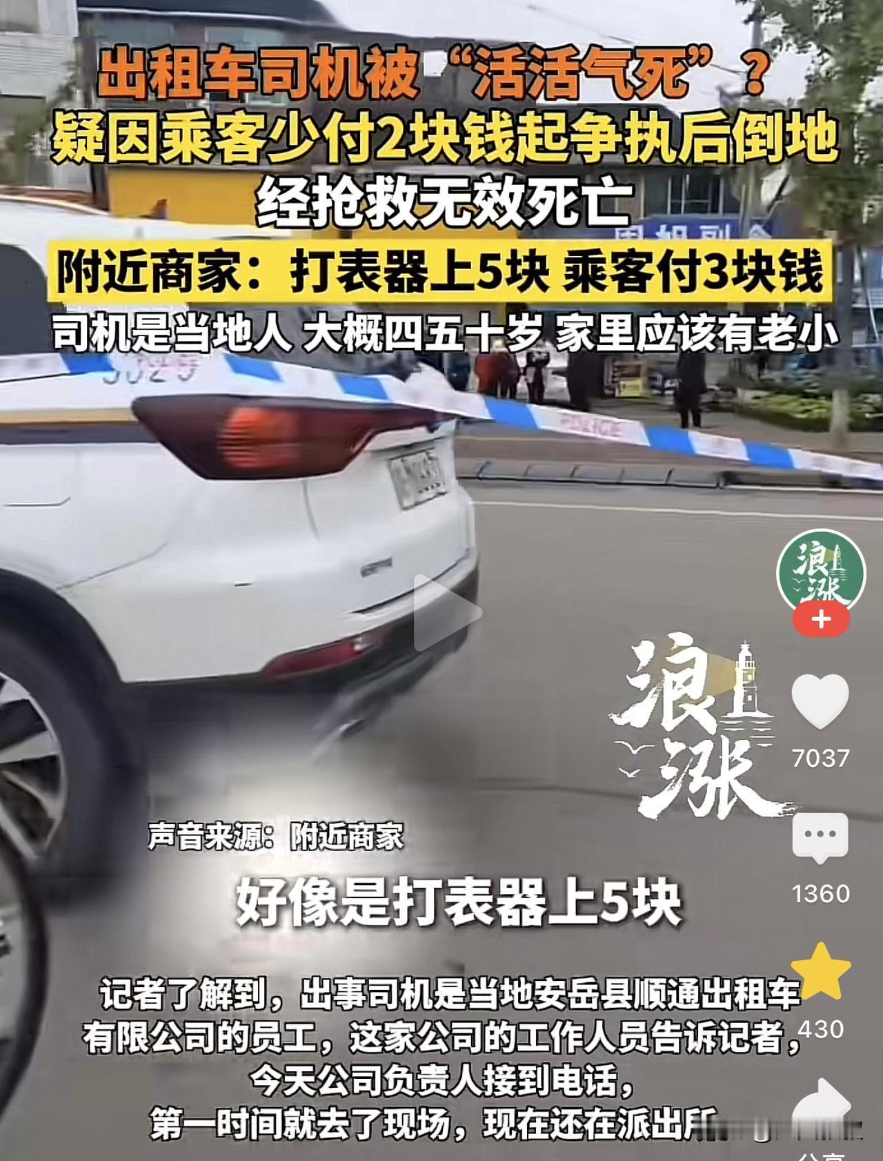四川资阳,一出租车司机疑因乘客少给了两块钱,双方发生了争议,结果司机却突发意外不省人事,急救人员在现场进行了急救,奈何最终还是未能挽回司机生命,事发后,附近商家表示,就是乘客少给了两块钱,司机被活活气死了,警方目前正在对死者进行死因鉴定。 据悉,司机是当地人,大概是五十岁,现场视频显示,有急救人员正在对一倒地的男子进行急救,而事发附近的商家表示,到了目的地,表显是5元,乘客给了3元,还差了2元,司机就有点上头,发生了争执,可能是突发脑梗还是心脏出了问题,最后抢救无效去世。 事发后,有出租车司机就说,真的是什么乘客都能碰到过,以前开出租车,起步价是6元,下车的时候乘客非要扣除这6元,说水电都是零起步,就你是6块钱起步,所以这个起步钱要扣除去,你说遇到这样的乘客能气吐血吧?估计这个和我遇到的情况差不多。 还有人说,我开饭店的,菜单明码标价,有顾客吃完要抹个零,就把零头抹了,他结果又用优惠券,我到手又少了20多,结果他走了之后给平台投诉说饭菜不好吃,要退款,如果不是法律保护他,我真的是。 那如果司机是突发脑梗还是心脏出了问题,最后导致了死亡,需要乘客负责吗? 这就要看乘客在这个事件中是否有过错了,如果有过错,自然要承担责任,如果没有,则无需承担。 民法典第一千一百六十五条规定,行为人因过错侵害他人民事权益造成损害的,应当承担侵权责任。 所以,因为表显费用是5元,作为乘客,有义务按照表显的数额付款,而不是自行支付3元,由于顾客少给费用,显然是一种过错,加上如果双方因此发生争执,那么,顾客的过错会进一步增大,在这种情况下,如果是需要承担赔偿责任的。 考虑到是司机自身疾病导致的,并不是顾客直接造成的,所以,司机本身承担责任是主要责任,而乘客则是次要责任,根据最终的损失大小,最后由法院来判决顾客到底是占10%还是30%的责任。 当然,因为是司机自身疾病导致的,并不是顾客导致的死亡,顾客本身也预见不到,因此不能追究顾客过失致人死亡罪的刑事责任,本身来说,打车也才5块钱,如果不想打,完全可以做公交车,没必要为了既要达到省钱的目的,享受比公交车更好的服务,结果却要求和公交车一样收费。 对此,你对本案有什么看法? —————————— 关注我,带你评析法律热点,关注冷暖人生。 文章原创,抄袭必究