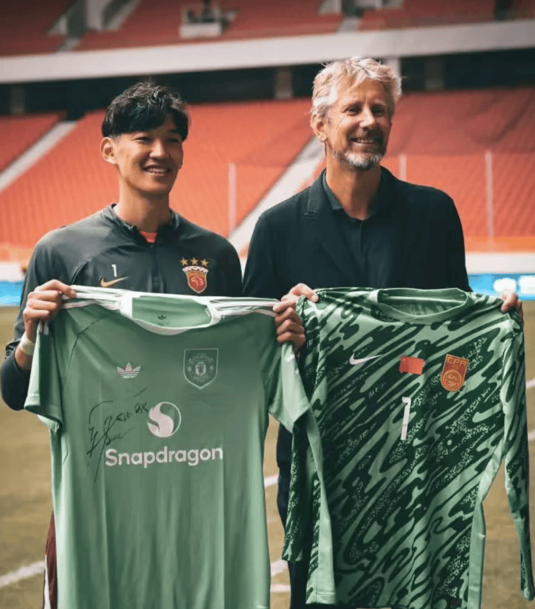 赛前训练之余,他和海港队主力门将颜骏凌交换签名球衣并合影。颜骏凌小时候接受采访就表示,自己的偶像是范德萨。