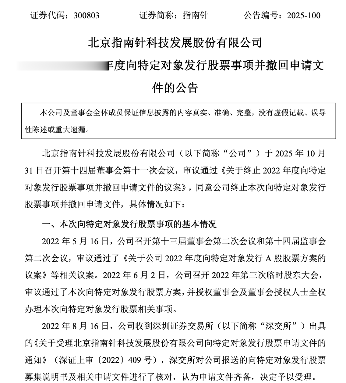 10月31日,指南针发布重磅公告,宣布终止2022年度向特定对象发行股票事项,并撤回相关申请文件。这一决定是公司结合内外部客观环境、自身发展战略目标等多重因素,经相关各方充分沟通与审慎论证后作出的重要决策,标志着这场历时三年多的融资计划正式落幕。