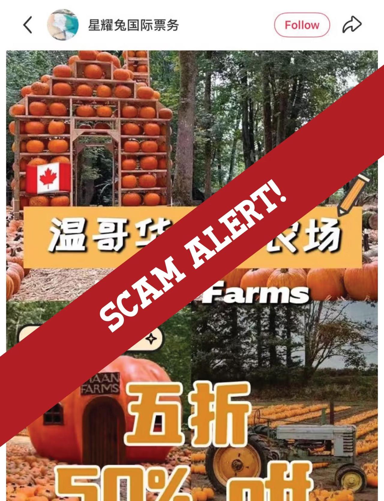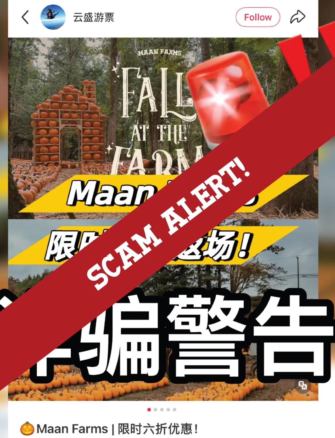 ⚠️ 诈骗警告 / SCAM ALERT ⚠️ 本季我们不幸发现有一些账号冒充我们在非法售卖门票。这些账号会以低价为诱饵,但实际上是使用被盗信用卡购买门票。请大家务必小心,不要上当受骗! 我们与这些账号没有任何关系,并且已向平台举报。 @春野票务代理咨询 @悠猪助手 票小赛 @票票去哪儿 @星耀兔国际票务 如果您通过这些或其他非官方渠道购买门票,而门票在入场时被判定为无效,我们将无法提供退款或补偿。 为保障您的权益,请务必通过我们的官方网站购买门票。 您的安全与信任对我们来说非常重要,感谢您帮助我们共同维护一个安全、诚信、透明的社区。❤️ maanfarms pumpkinpatch fallatthefarm frightfestival halloween