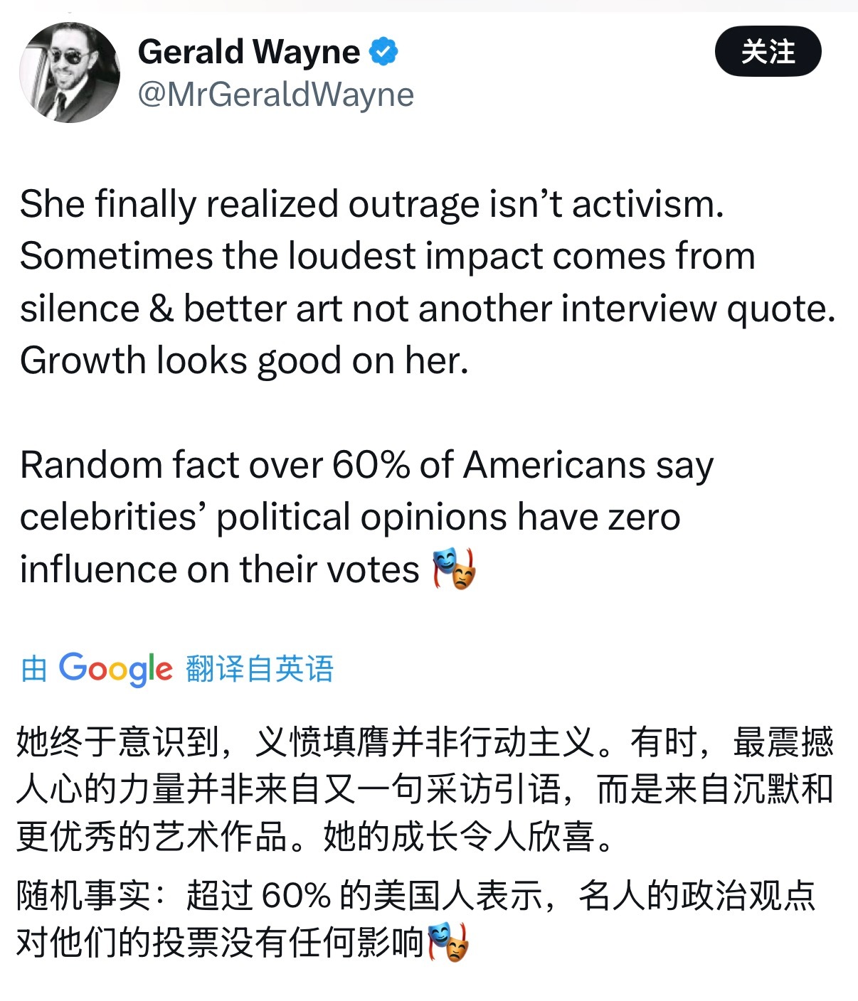 “我觉得我正处于一个复杂的调整期,因为我同时也是一名艺术家,在如今这种局势下,(谈论自己的ZZ观点)事态可能朝着意想不到的方向发展。我不想因为人们不喜欢我的ZZ观点而让他们对可能改变意识或改变世界的电影和艺术作品产生反感,我想保护我的艺术创作,让大家能够继续沉浸在我的作品中。如果我的作品不能带来任何和平、缓和紧张局势或提供解决方案,我不想成为问题的一部分,我不想让问题变得更糟……我尝试通过作品来表达我的ZZ观点。我制作公司出品的很多电影都是对当前ZZ局势的反映,我觉得这是我能够发挥作用的方式。”造浪吧国庆档
