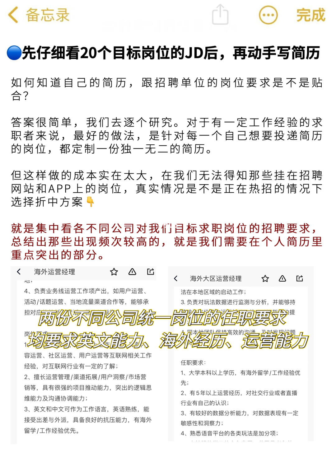 要尽可能挖掘JD中要求的特质,以及那些属于自己的独特优势,比如复合背景、跨文化背景、技术型人才等等。