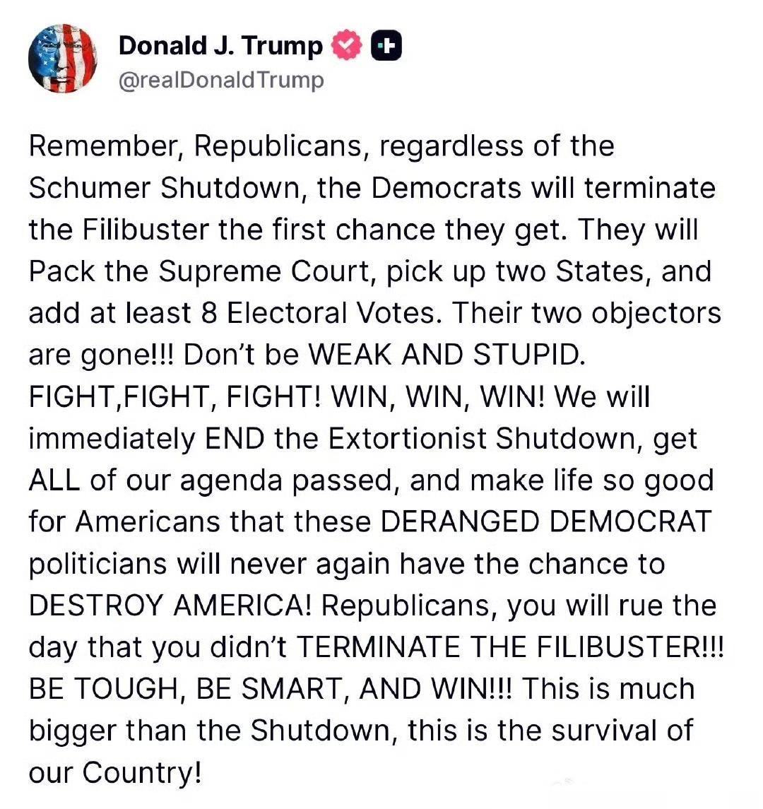 特朗普鼓励共和党以牙还牙,面对舒默停摆,废除Filibuster 特朗普: 记住,共和党人,不管舒默引发的停摆如何,民主党人一有机会就会废除阻挠议事(filibuster)。他们会把最高法院扩编、拿下两个州,并至少增加 8 张选举人票。 他们的两名反对者没了!!!不要软弱也不要愚蠢。战斗!战斗!战斗!赢!赢!赢! 我们将立刻结束这一敲诈式的停摆,推动我们全部议程通过,让美国人的生活好到让这些疯狂的民主党政客再也没有机会摧毁美国! 共和党人,你们将会后悔那天没有废除阻挠议事!!!要强硬、要聪明、要取胜!!!这事比停摆还重要,这关系到我们国家的生存!
