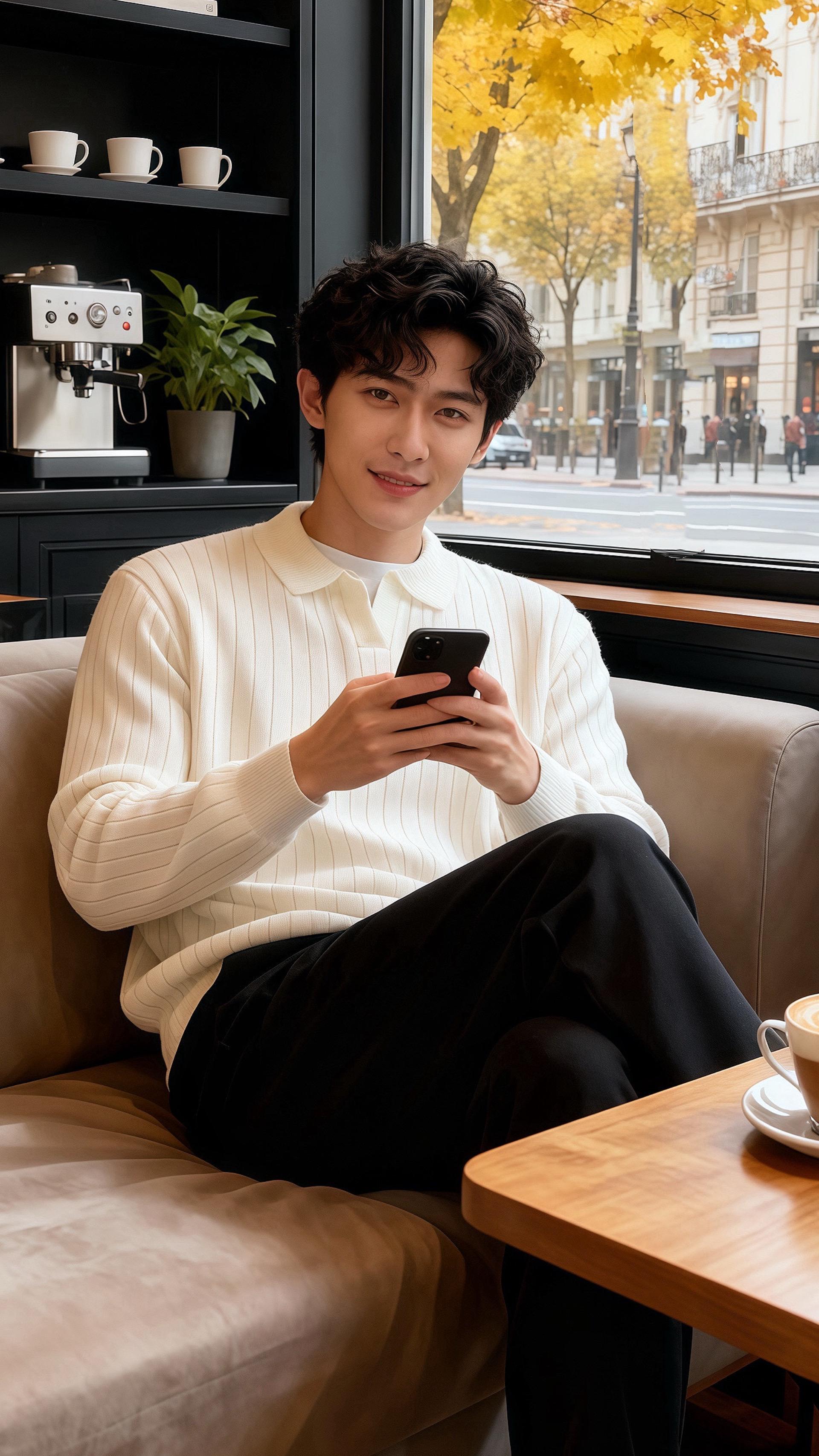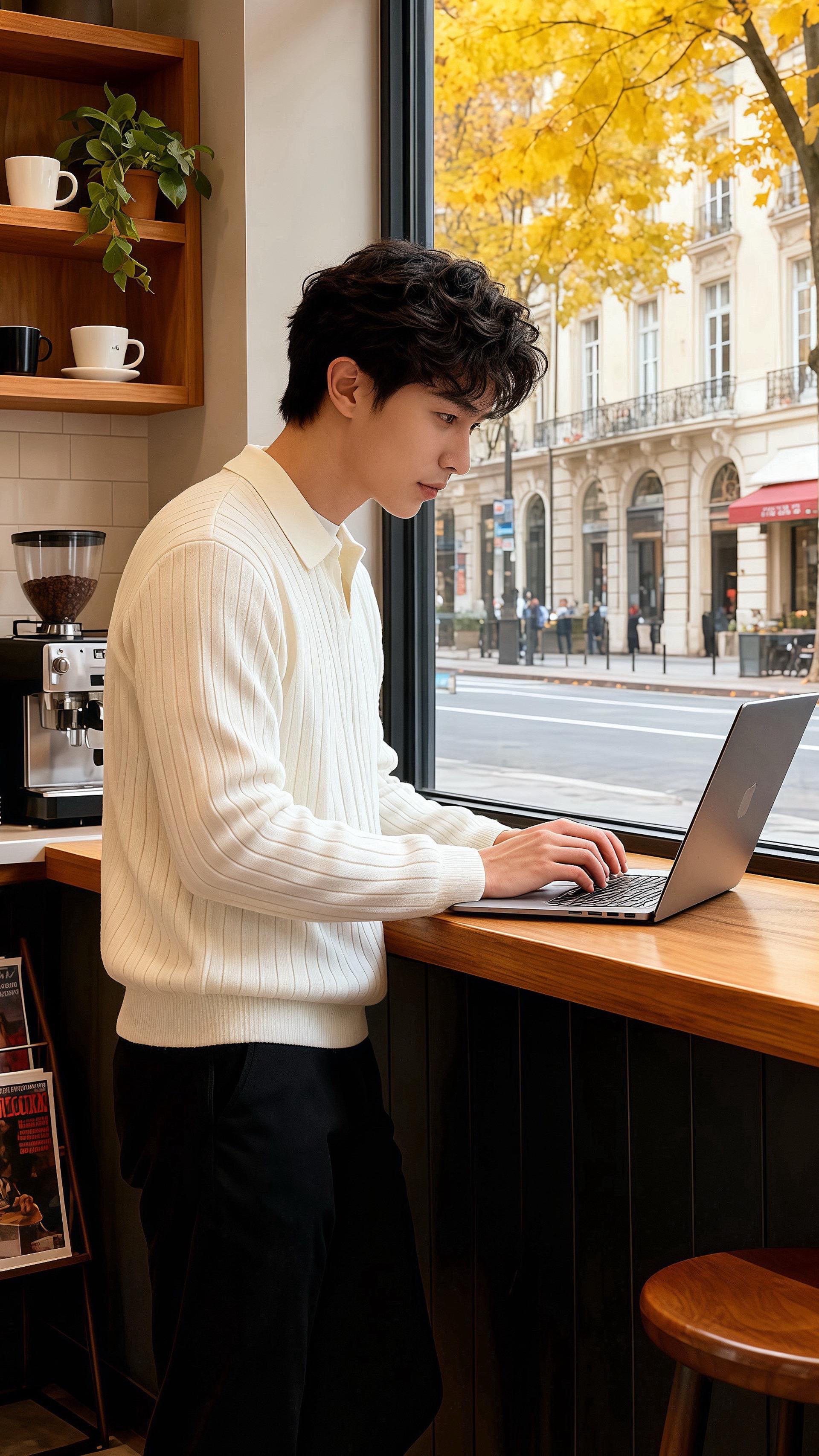皓明倚着木台敲键盘,米白色的竖纹针织衫衬得肩线清润,领口露出的白T边边角角都透着软和,黑裤的垂感裹着浅淡的光影,连腕间的骨节都浸在暖调里。他指尖顿在键盘上,抬眼时,窗外的银杏叶刚好落在玻璃上,光斑裹着他的衣纹,像把整个秋日的温软都织进了这身穿搭里。