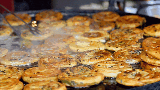 煎制葱油饼时,凹凸不平的面团表面会形成细小“油池”,使更多油渗入饼皮。