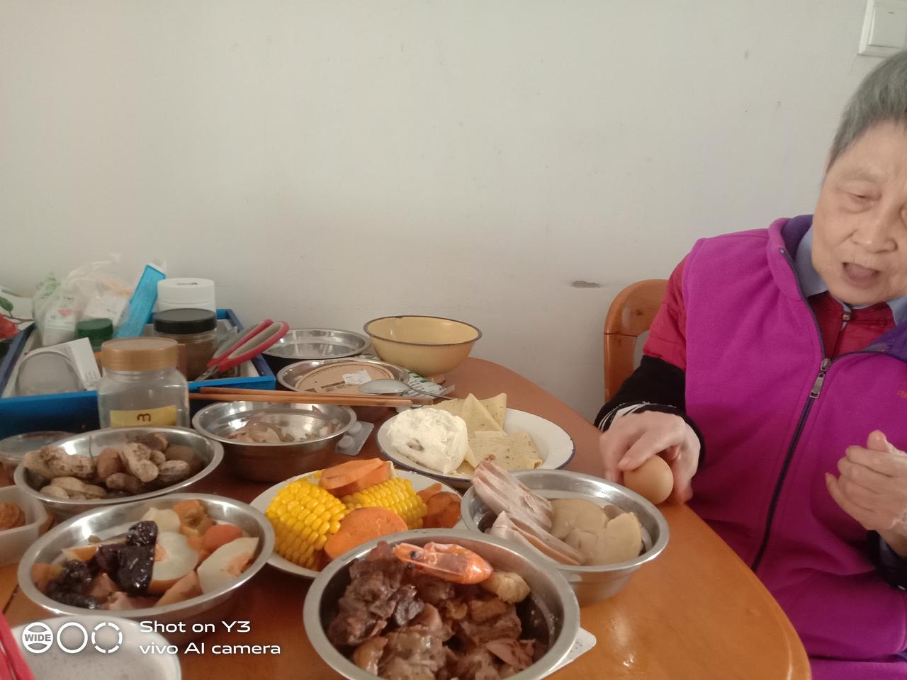 边上班边照顾80多岁的老母亲。 今天是星期天,这是我做的早餐。真是老一套,玉米,红薯,花生,板栗。 然后苹果,梨枣,山楂,枸杞放在一个小碗里蒸熟。这是甜点。 早晨的豆浆是黄豆,绿豆,枸杞,薏仁,红豆,黑豆,大米,江米,小米,黑米。 这是早晨的豆浆,通常早上的豆浆喝不完,我们到晚上再热一下继续喝。 这可不是,我懒省事儿。是豆浆机一次要打四个人的,至少也得是三个人的,两个人的豆浆机不干话。 这些都是每天必备的,今天因为不上班,所以我特意摊了煎饼。 母亲开心的吃了一个,我也吃了一个。 早饭还没吃完,我就和母亲开始商量中午吃什么。 母亲说中午想喝馄饨,好的。吃完早饭就去菜市场。 母亲吃完早饭就是老一套,喝药,上厕所,然后睡大觉。 我则是洗洗刷刷,休息一会就去菜市场。 你们是怎么照顾老人的。