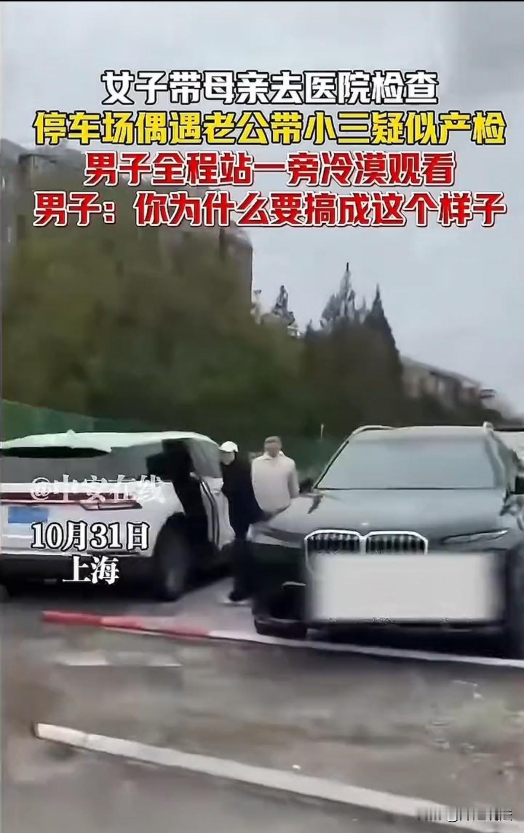 上海,男子带着女子疑似去产检,被妻子撞见。妻子上前询问两人是不是怀上了,男子没有