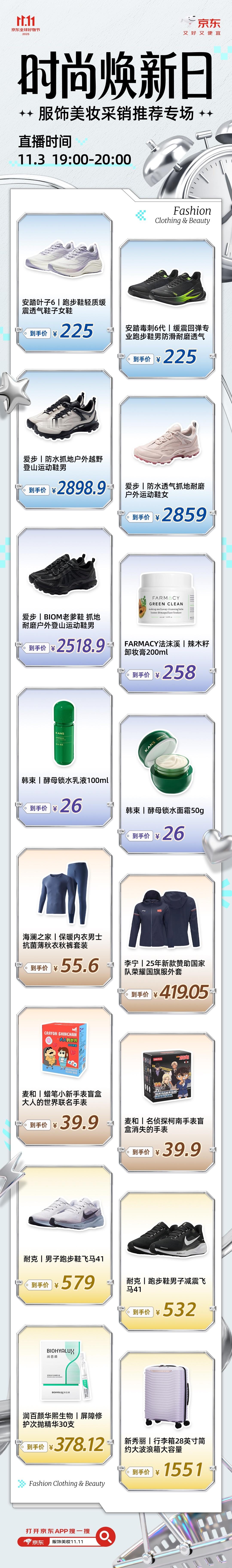 11.3京东时尚焕新日 全天候福利警报拉响!京东时尚焕新日还真是换着花样给大家整福利,从早8点到晚23点,每个整点不同品牌轮番上阵,明星福利和好价福利拿到手软,还有0元抽MCM联名JOY玩偶太爽啦!一到整点就整活 11.3 来京东搜索“服饰美妆1111”,8-23点整点送福利,连送16小时。19-20点京东服饰美妆直播间专场直播,采销上阵送好货,直接低至62折,韩束酵母锁水乳液100ml到手价只要26元!速戳【】接稳!京东11.11 又好又便宜 买服装上京东