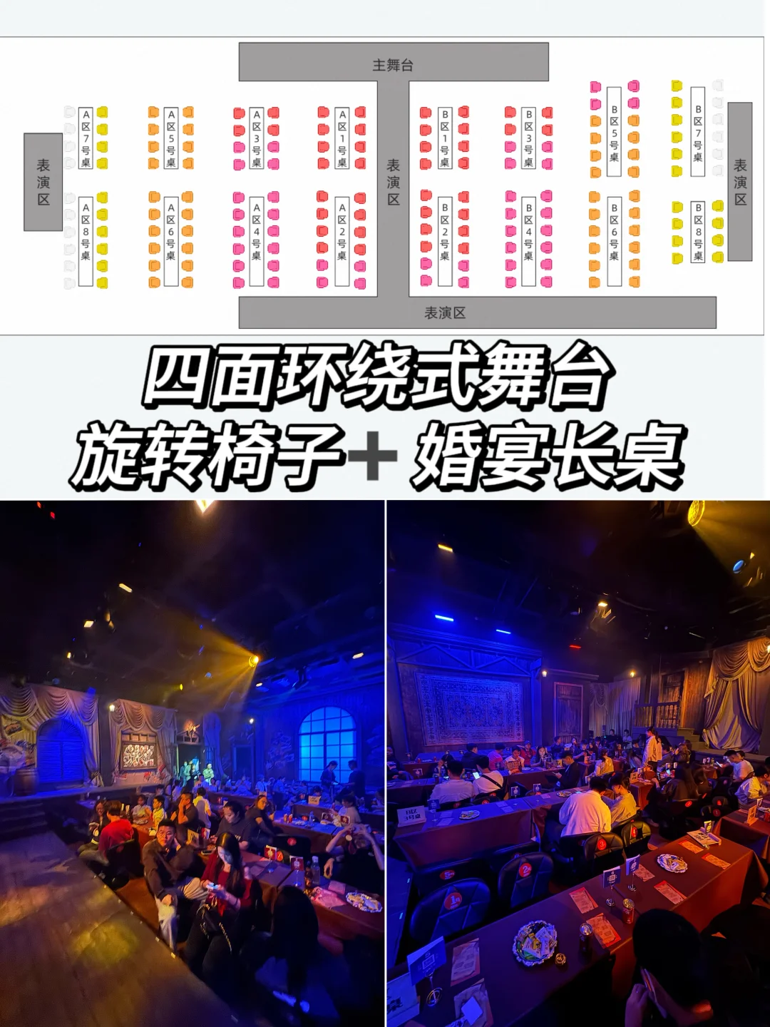 2️⃣观演长桌设计:观众都是来参加婚宴的,全部坐在长桌内,长桌有零食,边吃边看,太有趣了吧!