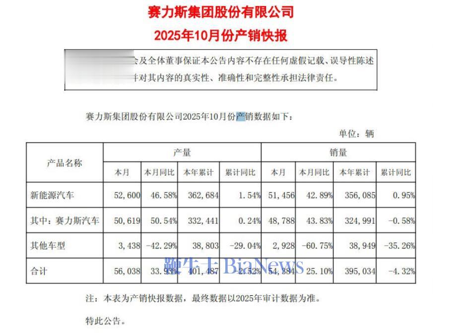 赛力斯:10月新能源汽车销量51456辆,同比增长42.89%