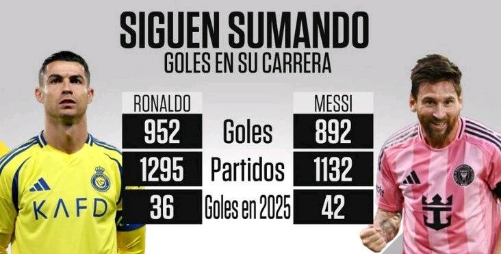 C罗双响助球队逆转、梅西破门难救主球队濒临淘汰…… C罗生涯1295场比赛打进952球,其中2025年打进36球。 梅西生涯1132场比赛打进892球,其中2025年打进42球。 梅吹换个角度:梅西是2025年进球最多的5名球员之一,与此同时,大2岁的罗纳尔多……