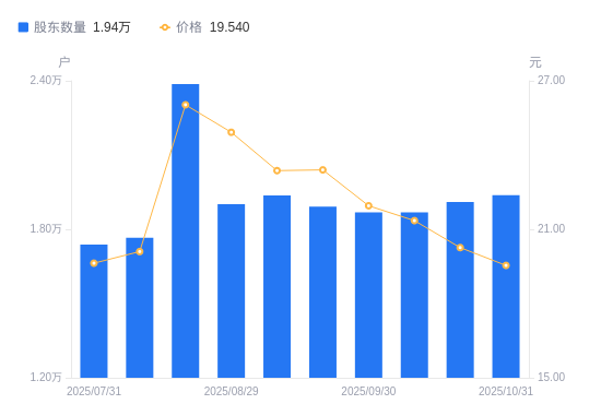 日期A股户数(户)流通A股户均持股数(股)户均持股市值(万元)2025-10-31193778116.0415.862025-10-20190988234.6116.682025-10-10186898414.8217.972025-09-30186888415.2718.472025-09-19189108316.4819.462025-09-10193688119.8118.982025-08-29190168270.1220.612025-08-20238696588.6517.152025-08-08176538908.6617.912025-07-31173859045.9917.76