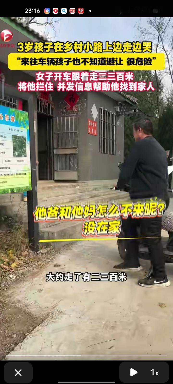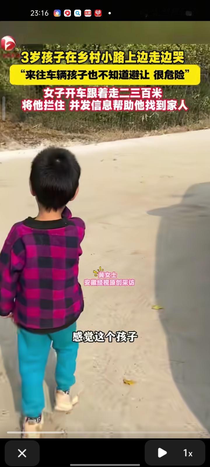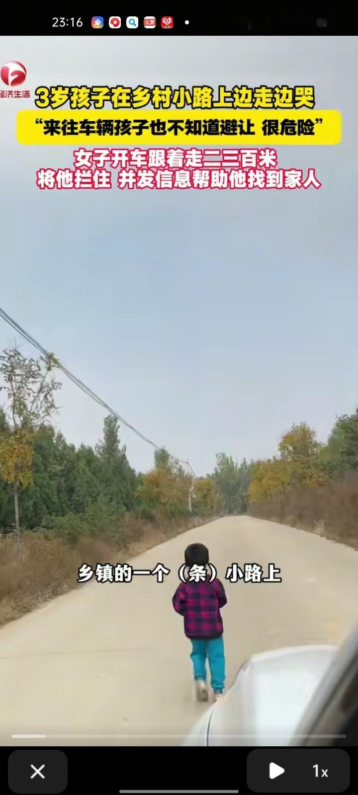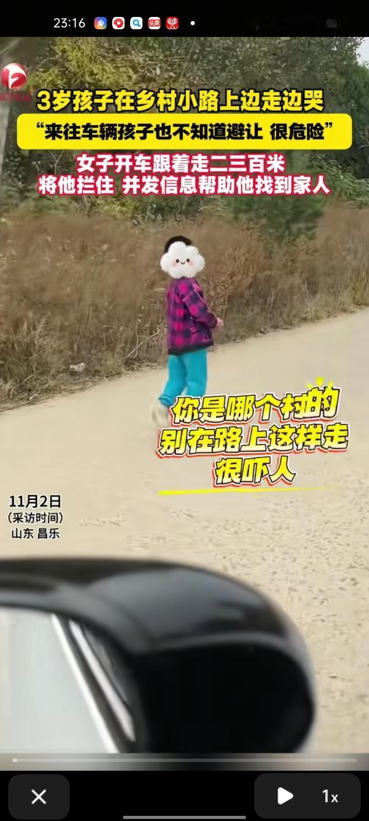 10月31日,潍坊市昌乐县。女子开车行驶途中遇到三岁小孩在路上边走边哭,来往车辆也不知道避让,非常危险。感觉这个孩子可能是迷路了,方向是往北走的,往北的方向存在很少,便开车跟着他走了二三百米,把车停下后将他拦住。 当事人黄女士表示,自己是镇上的工作人员,村里的社区书记都认识,就把照片发给村里的社区书记,过了差不多搬校区,有村支书在群里回复那个孩子是他们村的,村里有人就拉着孩子的奶奶来了。路上看见孩子这样,心里就很难受,肯定会帮他找到他的家人,尽自己的微薄之力。