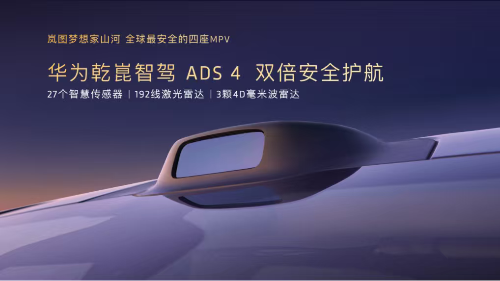 对于商界精英而言,安全从来不是“选择题”,是关乎家庭圆满、事业长青的头等大事。岚图梦想家山河联合华为,以超一流的整车制造标准,力求打造全球最安全的四座MPV。新车搭载华为乾崑智驾ADS4,硬件、架构和算法全面升级,集顶尖主动安全、被动安全、隐私安全、健康安全于一身,为用户带来“山河”永固般的安心保障。