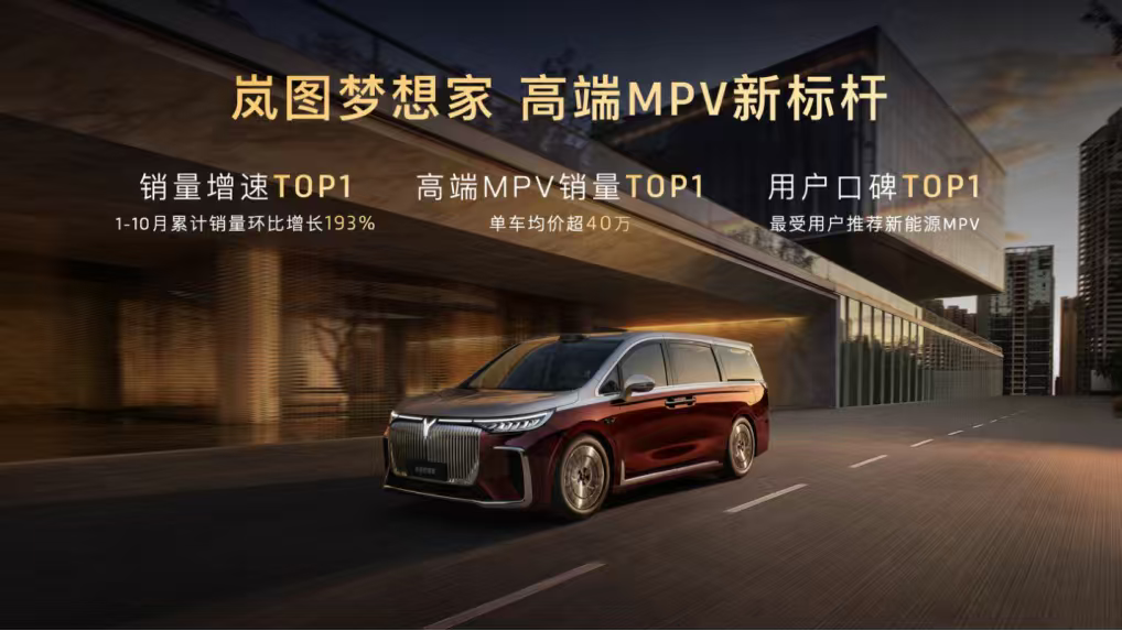 今年前10个月,岚图梦想家累计销量增速第一,单车均价突破40万元,持续蝉联高端MPV销量冠军,每卖出3台高端MPV,就有1台是岚图梦想家。在权威第三方调研中,岚图梦想家更获评“最受用户推荐新能源MPV”,实现销量与口碑双丰收。