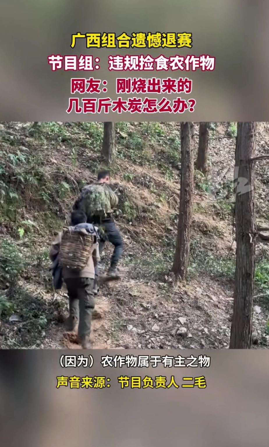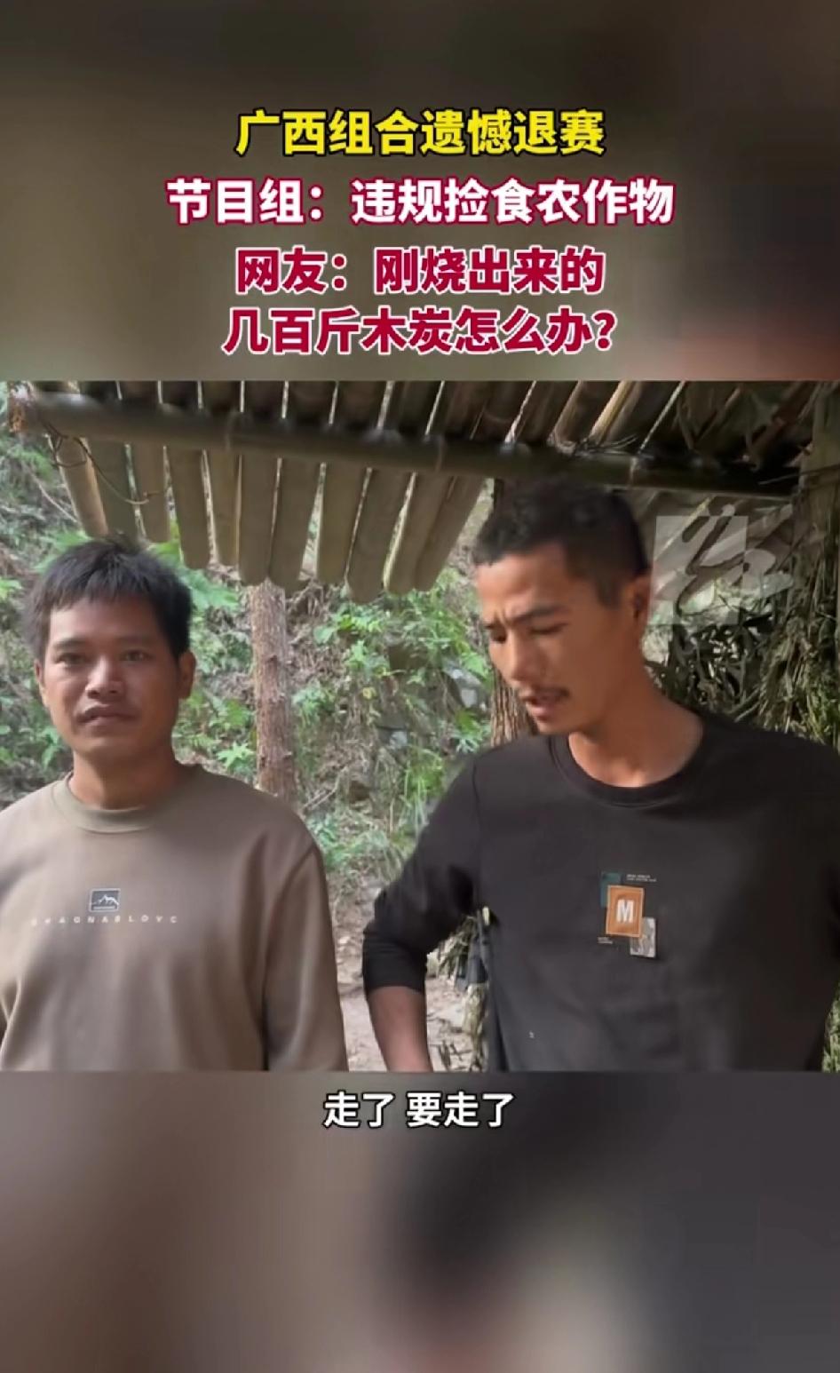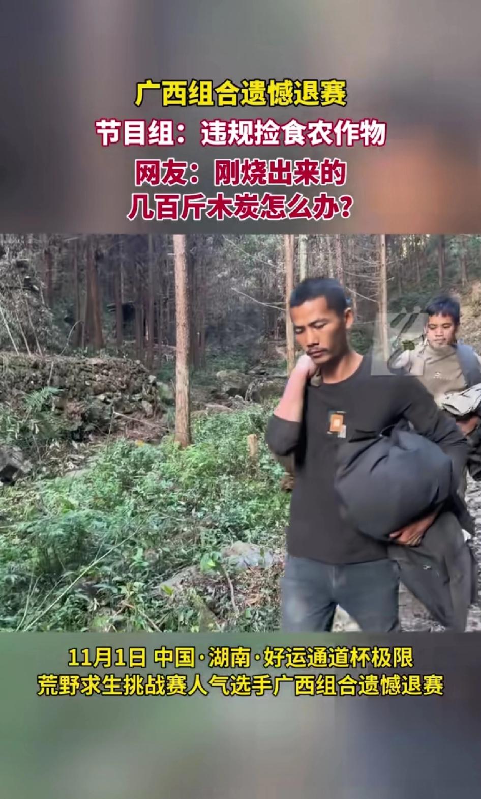 11月11日好运通道杯荒野求生极限挑战赛人气选手广西组合遗憾退赛! 节目组:违规捡拾农作物! 荒野求生比赛要求不可以捡拾农作物 南瓜是农民种的属于有主的农作物! 所以节目组判二人违规! 广西组和因为捡了一个南瓜被节目组告知违规操作,提前退赛了! 可以看出二人心有不甘,本来二人来比赛打算拿冠军的,已经烧出几百斤木炭来准备过冬了! 这二人堪称参赛组为数不多的技术成员! 这次违规网友们都好奇烧好的木炭怎么办?也替二人提前退赛感到可惜! 本来以二人现在的状态有可能夺冠的。 广西组选手有高光也有遗憾。此前张家界荒野生存挑战赛第二季,来自广西百色的32号选手“苍狼”就特别吸睛。他在溪边搭建的“世外桃源”庇护所,地上干草整齐,四周有简易篱笆,还挂着藤蔓木板秋千,圈了不少粉。 大家都觉得他“最有可能进决赛”,可比赛到第12、13天,他脚踝冻伤,从痒肿发展到流脓,伤情恶化,在10月25日宣布退赛,让粉丝直呼可惜。还有广西“抖哥”,在荒野求生决赛第37天主动退赛,称“对手太强了,第二名和第三名没区别”。 这些退赛让人感慨比赛无常。