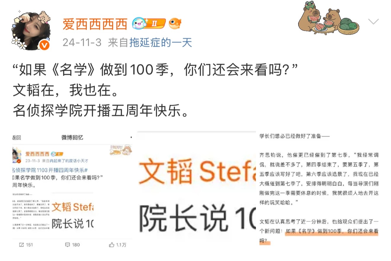 “如果《名学》做到100季,你们还会来看吗?”还是这句话,文韬在,我也在。名侦探