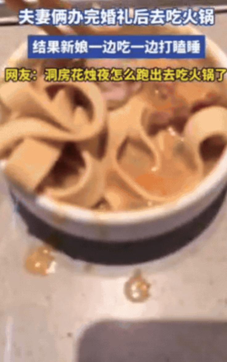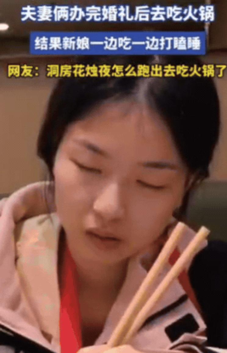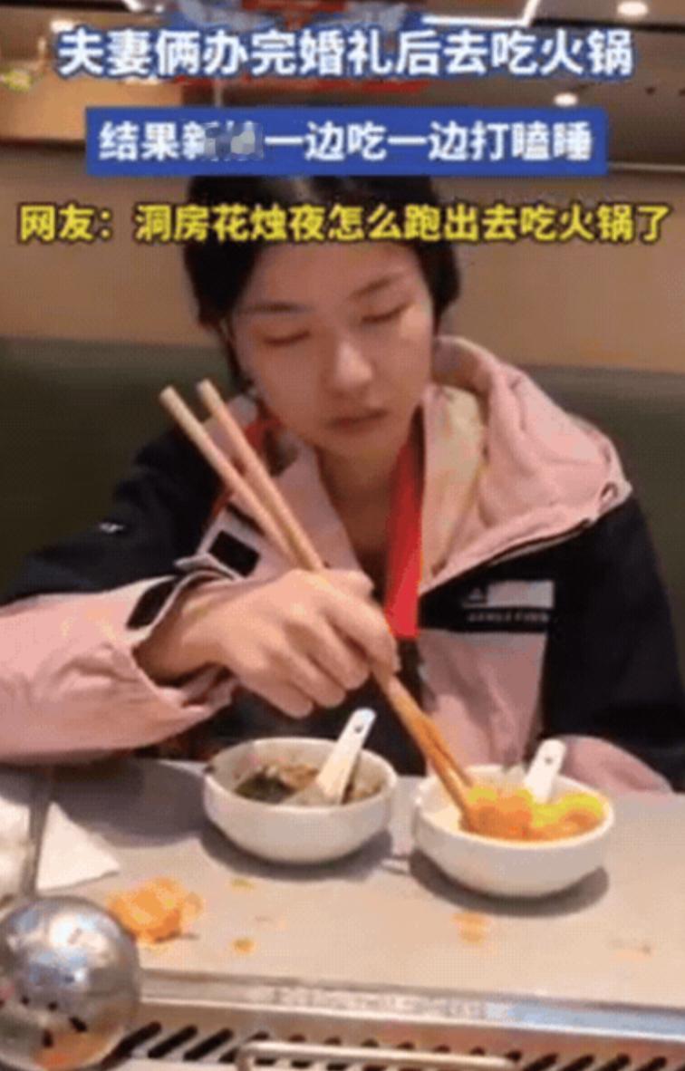 笑不活!江苏一对夫妻办完婚礼,新娘说没吃饱,2人竟然不急着入洞房,反而加餐吃火锅,结果,新娘一边吃一边打瞌睡,没一会儿就睡着了!手中的筷子还插在碗里,反观新郎,在旁边吃得老开心了!网友:洞房花烛夜怎么跑出去吃火锅了? 江苏那对刚办完婚礼的小夫妻,最近在网上火了不是因为婚礼多盛大,也不是婚纱照多惊艳,而是仪式结束后干的事儿,放着 “洞房花烛夜” 的讲究不管,俩人先跑去吃了顿火锅,结果新娘吃着吃着直接在桌上睡着了,手里的筷子还直挺挺插在芝麻酱碗里。 说起来这画面也挺有意思的:新娘还穿着敬酒时的红色礼服,裙摆皱巴巴地堆在椅子上,脑袋随着呼吸一点一点的,像是随时要栽进面前的火锅里。 仔细看她嘴角还沾着点没擦干净的芝麻酱,显然是刚吃了两口就撑不住了,最绝的是那双手,还保持着夹菜的姿势,紧紧攥着筷子,筷子尖就那么扎在调料碗里,连放下来的力气都没了,是真的累到极致了。 旁边的新郎瞧见这模样,没忍住低低笑了一声,还轻轻喊了妻子两声,可新娘一点反应都没有,脑袋歪在胳膊上呼吸都变沉了,明显是熬到深度睡眠了。 他也没再叫醒她,掏出手机悄悄拍了张照片,然后自己拿起漏勺,接着涮锅里的肥牛卷,一边吃还一边时不时看一眼妻子,眼里满是无奈又心疼的笑意。 这张照片被新郎发到网上后,评论区立马炸了,有人笑 “这大概是最接地气的新婚之夜了”,更多人却跟着共鸣,最关心的一个问题就是:“洞房花烛夜啊,怎么不回家反而跑出来吃火锅?” 答案其实特简单,饿还有累,外人看婚礼,总觉得是王子公主的高光时刻,婚纱好看、仪式浪漫,满场都是祝福的声音,可只有办过婚礼的人才知道,那根本不是什么 “童话时刻”,而是一场持续十几个小时的 “体力马拉松”,从早到晚连轴转,能撑下来就不错了,更别说顾上吃饭睡觉。 就说这对小夫妻,婚礼前一天晚上,俩人就没闲着,一会儿要跟婚庆确认第二天的流程,生怕哪个环节出岔子,一会儿要招待从外地来的亲戚,安排住宿、聊家常,忙到凌晨一两点才勉强躺到床上,合眼没几个小时,第二天早上五点多就被闹钟叫醒了。 新娘要开始化妆,涂粉底、做发型、穿婚纱,那身婚纱看着美,穿在身上又紧又沉,勒得人呼吸都得小心,新郎也没闲着要去接亲,还得应付伴郎团出的各种 “难题”,忙得满头大汗。 婚礼上摆的那桌丰盛宴席,鸡鸭鱼肉、山珍海味看着挺全,可新人根本没机会好好吃一口,要么是刚夹起一筷子菜,就有人过来要合影,要么是刚想坐下歇会儿,就被提醒该去下一桌敬酒了,到最后俩人连热乎饭都没吃上几口,全靠中间偷偷塞两块喜糖垫肚子。 所以等到婚礼结束,宾客走光,现场的狼藉交给别人收拾,俩人卸了妆、换了舒服点的衣服,第一反应不是回家,而是 “赶紧找地方吃点东西”饿到极致的时候,什么山珍海味都比不上一口热乎的。 他们也没挑地方,看见路边有家还开着的火锅店,就直接进去了,想着暖和暖和,也填填肚子,结果没想到,新娘是真的熬不住了,火锅刚煮开,涮了两口肉,沾了点芝麻酱,眼皮就开始打架,没一会儿就趴在桌上睡着了,新郎也没怪她知道她累坏了,自己慢慢吃着,还不忘帮她把外套盖在身上,怕她着凉。 (信息来源:网易新闻)