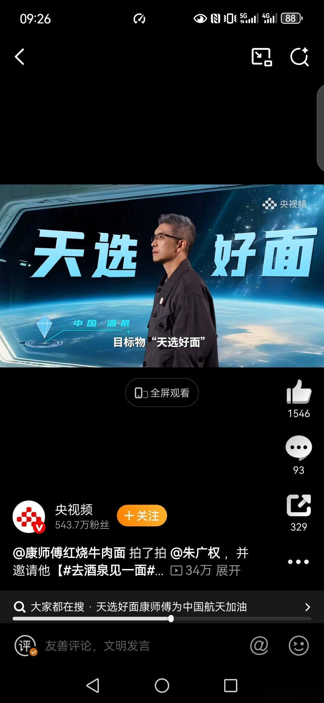 天选好面康师傅为中国航天加油 观看了视频,其实我自己一直也爱吃天选好面康师傅,准备今晚21:30,泡一碗康师傅牛肉面,锁定央视频《逐梦星辰》神舟二十一号载人飞船发射特别节目,让我们一起为中国航天加油。 ​​​