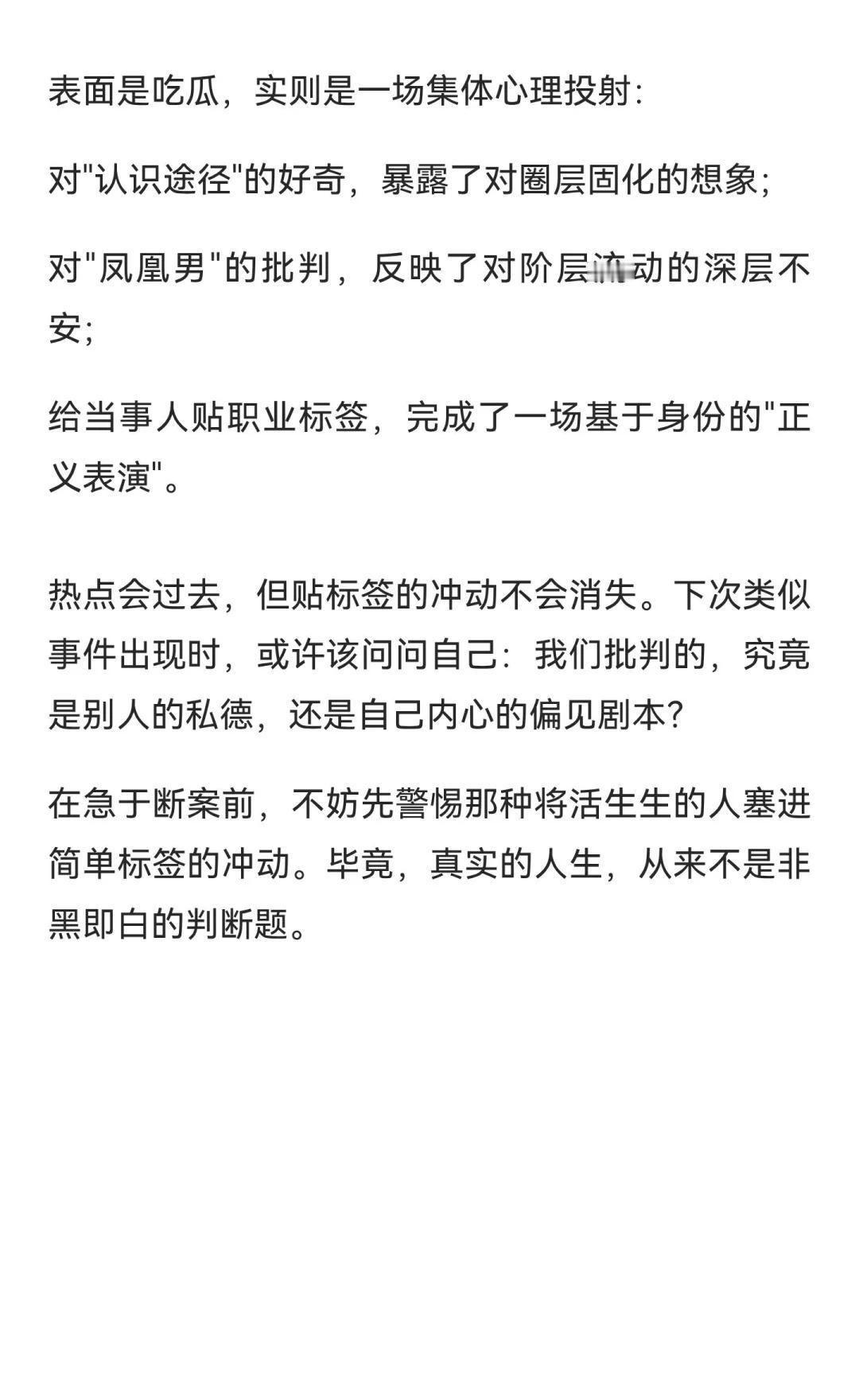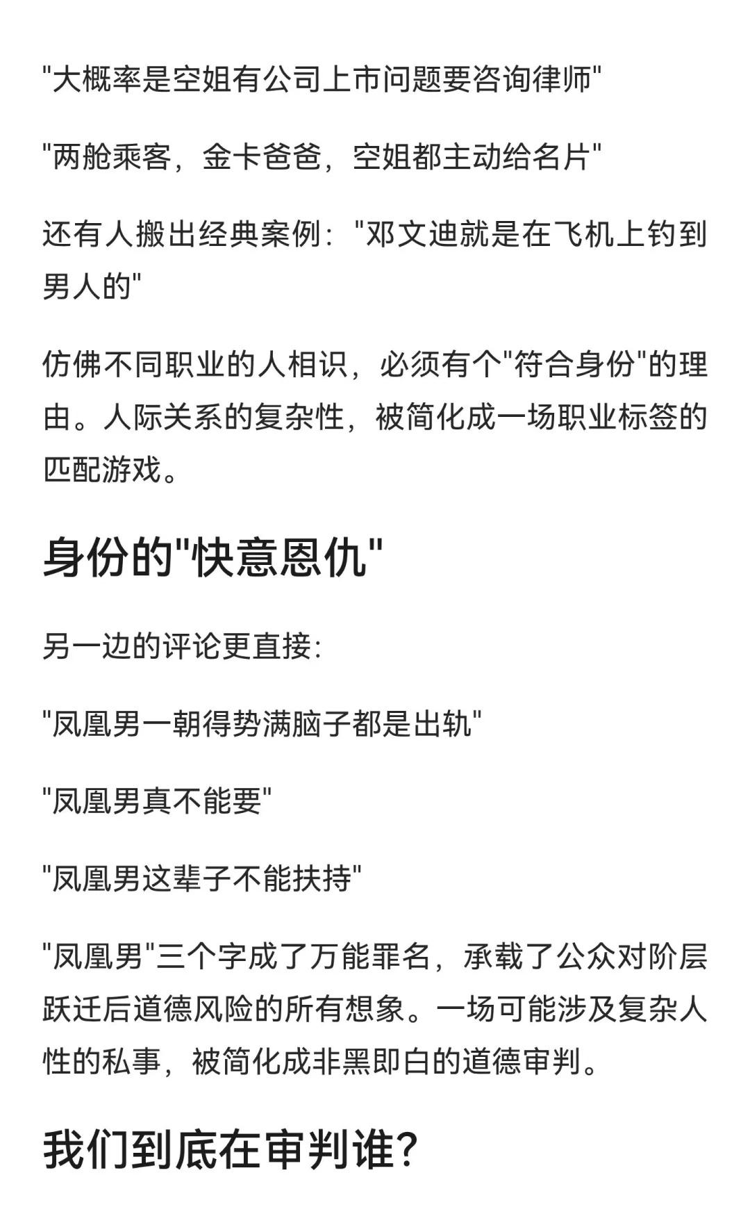 上航空姐事件:评论区比剧情更精彩 热点事件引发的集体断案,暴露了对职业身份的复杂心理投射。从“认识途径”的好奇到对“凤凰男”道德风险的批判,反映了对阶层流动的深层不安和对圈层固化的想象。真正的关系复杂,标签化的冲动背后是内心的偏见。热点 空乘 空乘日常 民航人 飞行员 空姐vlog 空乘专业 航空 上航