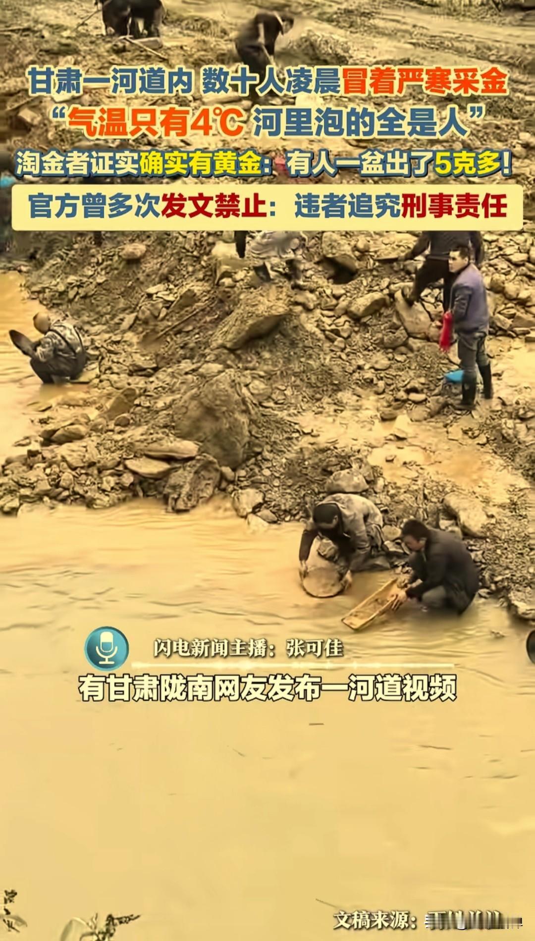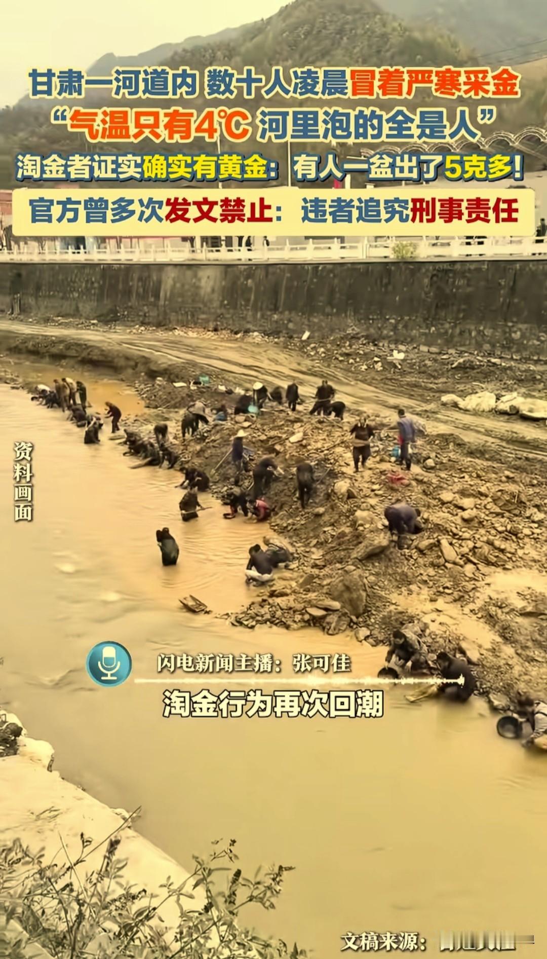 近日甘肃陇南康县燕子河,出现不少市民在凌晨时分冒着低温,拿着简易工具在河道里纷纷淘金的情况。 当日气温低至4度,但是阻挡不了人们对捞金的热情,淘金者使用铁盆、筛子等简易工具,据说有人一盆就捞出了5克黄金。 康县政府办工作人员已重申,明确禁止任何个人的淘金行为,康县公安局表示,近日已接到相关警情,并派民警到现场进行巡逻和劝离。 虽然燕子河因历史矿脉和河道清理再次出现黄金,吸引不少人冒险淘金,但是这一行为是国家明令禁止的违法行为。 当地政府指出,非法淘金行为不仅对河道安全构成潜在威胁,还破坏了河道的生态环境。 砂河金矿 淘金河床