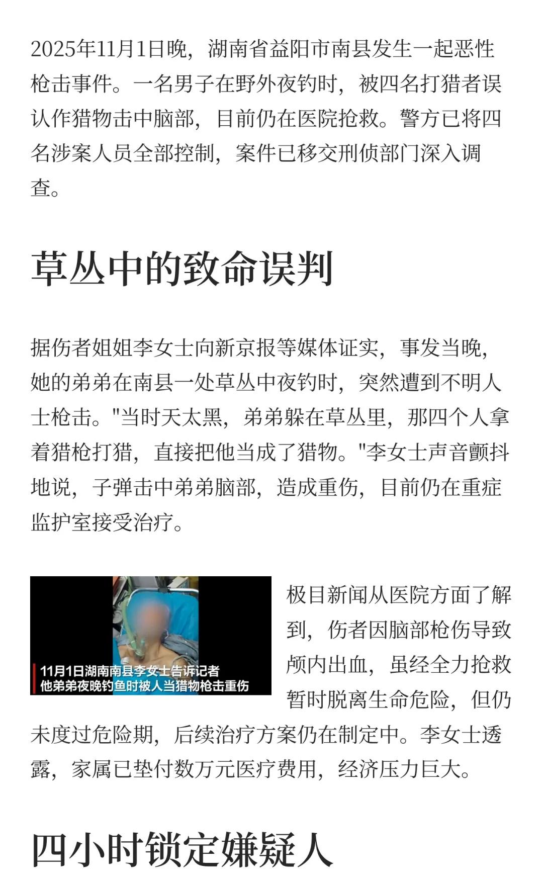 湖南男子夜钓被当猎物打!脑部中弹险丧命,4人被抓这教训太惨痛!湖南南县最近