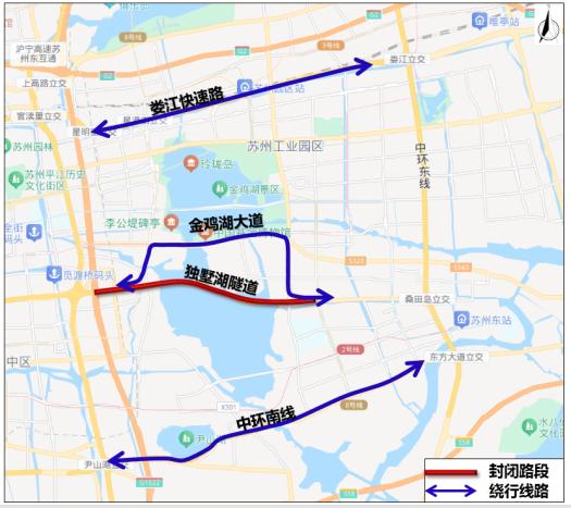 隧道养护施工期间,请机动车从金鸡湖大道、中环南线、娄江快速路等道路绕行。