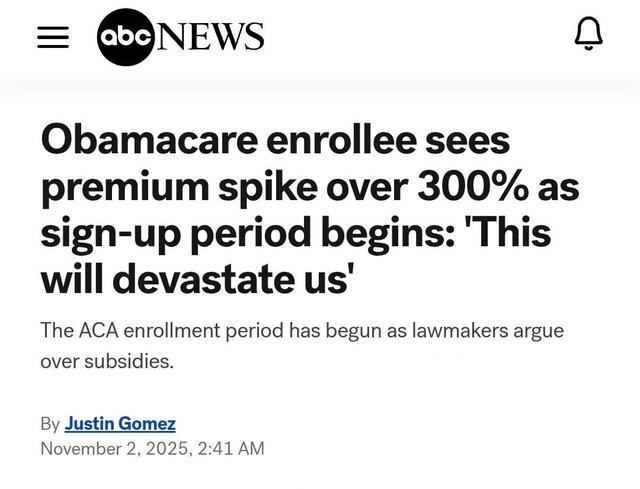 美国广播公司(ABC)报道称,《平价医疗法案》的参保者正在经受“毁灭性的打击”,文章援引犹他州小企业主斯泰西·考克斯的话报道说:“如果没有2026年的税收抵免,家庭医保保费用将上涨到每月2168.68美元,这太让人崩溃了,因为我们根本负担不起,光是那一张账单就比我们的房贷加上伙食费都高,相当于买医疗保险让我们的生活成本翻倍。”文章提到,民主党要求共和党就延长《平价医疗法案》补贴进行谈判,否则不会支持临时拨款法案;共和党则坚持,只有民主党先投票支持临时拨款法案,结束政府停摆,才会进行谈判,双方互相推诿、毫不妥协,却没有人关注到该法案补贴政策对每一个参保人的影响。