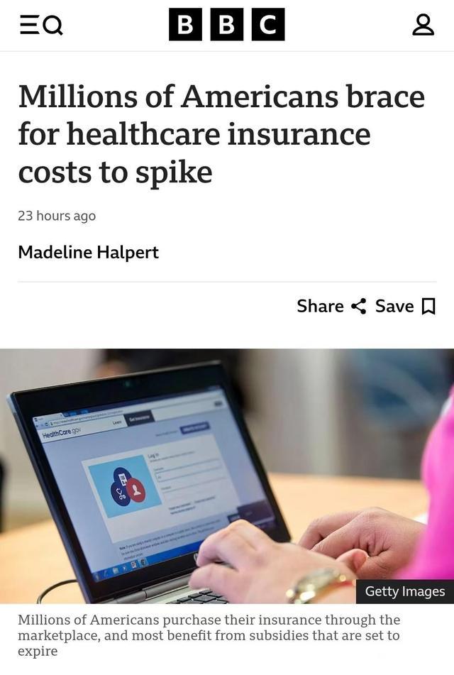 英国广播公司(BBC)报道称,在过去,参保人可以凭借税收抵免医保费用,民众缴税后,政府在医保方面给予补贴回馈,但目前这一政策因为共和党人的反对而被搁置,暂未能延期。BBC援引一家调查机构的数据报道称,如果没有政府补贴,所有参保人的每月医保费用平均可能上涨114%,这意味着每人每年可能要多花1000美元购买医保。BBC评论说,预计有约700万参保人会因为无法承担保费停止通过《平价医疗法案》购买医保,其中一小部分人会去购买其他保险,大部分人将彻底不再购买医疗保险。