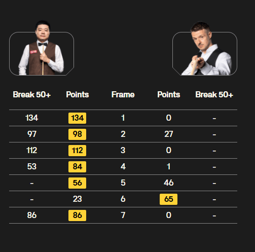 全场比赛,丁俊晖打出两杆破百(134、112)和三杆50+(97、53、86),霍尔特没有打出一杆50+。