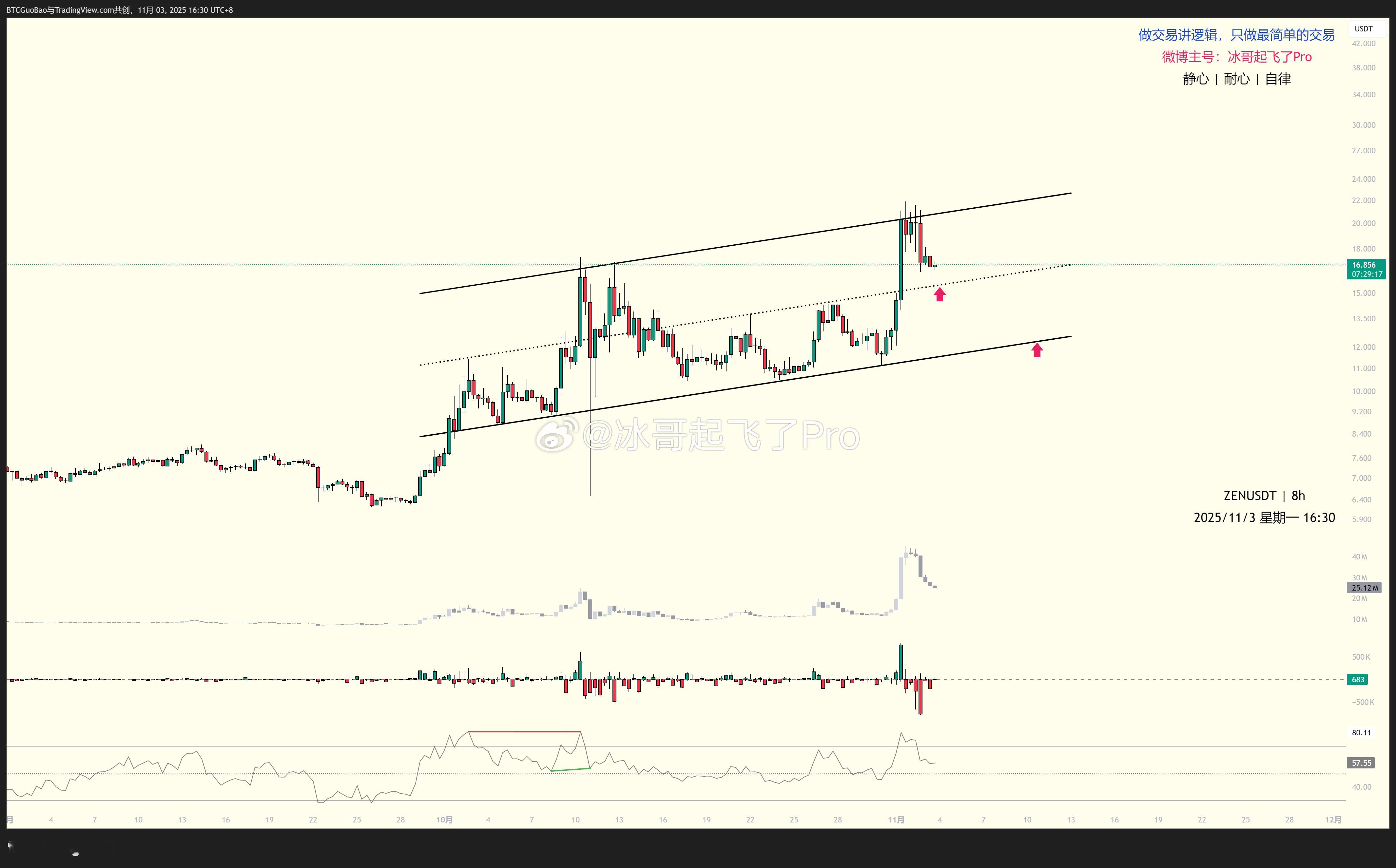 图1,ZEC有上升楔看空轮廓,但是还没走完也没跌破,这里要么直接跌破要么新高后在看空,4H 8H 1D级别RSI都出现背离情况了,涨幅太多了等跌破在能确定看回调,但回调能跌多少是个问题。
