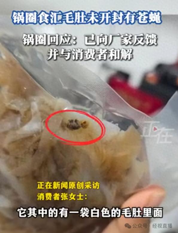 11月2日,吉林白山。张女士向记者反映,其在锅圈食汇购买毛肚带回家时,拆开外包装发现毛肚里含有一只苍蝇。张女士称,自己拆开外包装后,一袋白色的毛肚里含有一个黑色异物,“我一开始以为是花椒,后来仔细一看是苍蝇。”