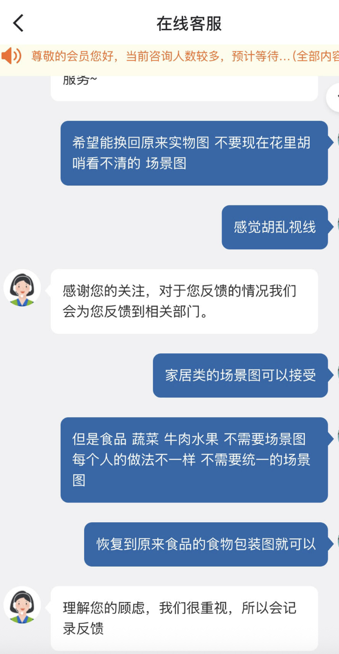 风波爆发后,3日下午,记者以消费者身份致电沃尔玛中国客服热线。客服人员首先证实了App的图片变化确系“相关部门”的“更新政策”。对于新图片“不够真实”“看不清分量”且“非常不方便”时,客服代表表示,虽然自己“也不是相关处理部门”,但可以“反馈一下这个问题”。