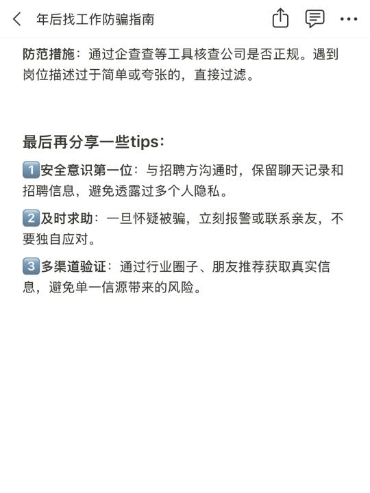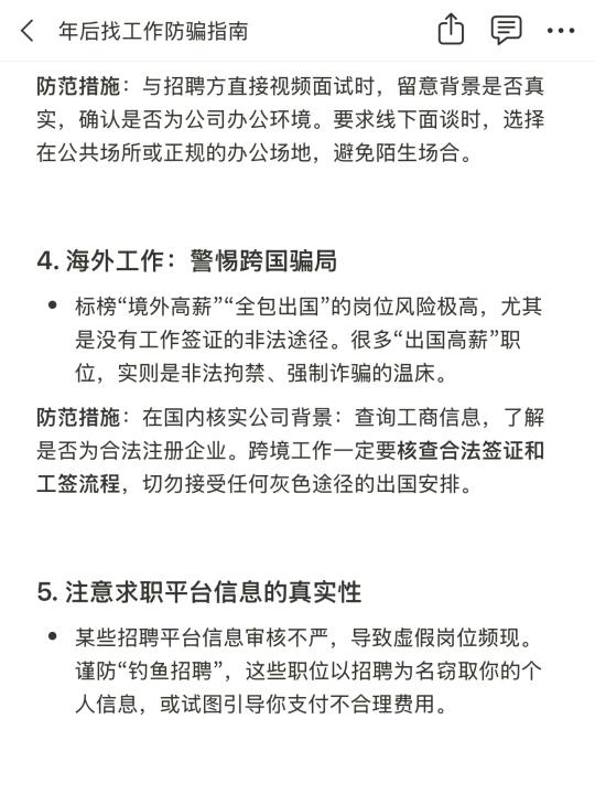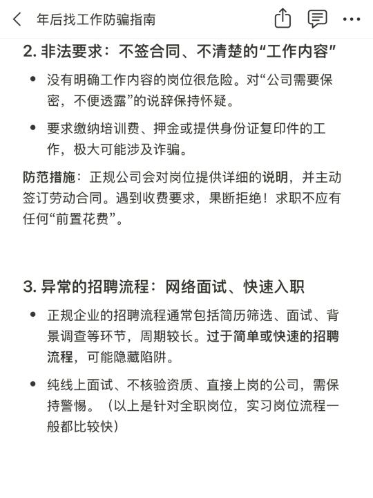 年后就是找工作高峰期了,面对市场上的五花八门的信息,大家要擦亮眼睛,守住自己的安全底线!总结整理了一份详尽的年后求职防骗指南,帮大家识别找工作中”危险“信号: . 1. 高薪诱惑:警惕“不合理的好处” 2. 非法要求:不签合同、不清楚的“工作内容” 3. 异常的招聘流程:网络面试、快速入职 4. 海外工作:警惕跨国骗局 5. 注意求职平台信息的真实性 . 不仅是个职场博主,分享真实有效的信息;还会不断分享成长干货,帮助大家提升自我! .