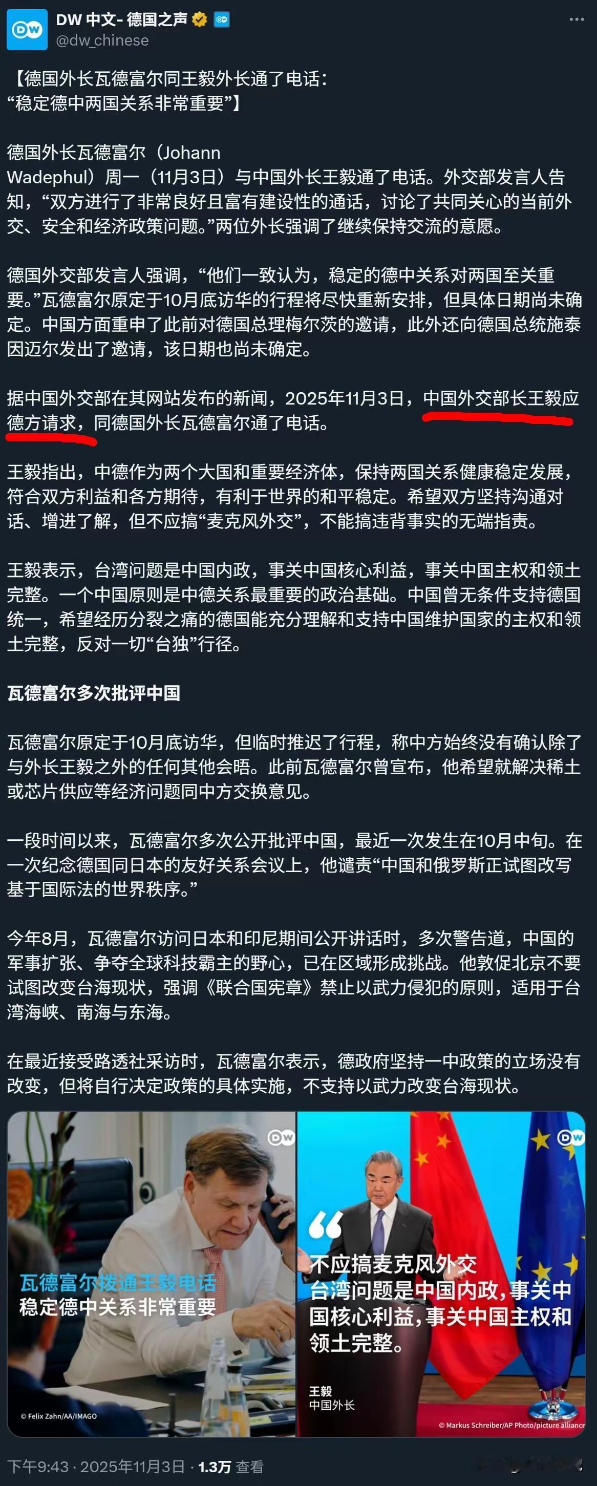 德国外长终于被骂醒了!在11月3日,德国外长瓦德富尔主动打电话来了。这次我们也不惯着他们了,直接说应德方的请求,在通话中,中方再次阐明了在台湾的立场,就是警告这位德国外长,不要在台湾问题上再说三道四,瓦德夫尔也很知趣,重申了在台湾问题上德国的立场,自从被拒绝来中方访问,这位外长在德国国内被骂惨了!德国媒体说得一针见血:瓦德富尔延续了前任那种说教式的对华政策,可德国现在最需要的是向中国学习,而不是对中国指手画脚。面对国内的指责,这位外长可能清醒了!再拿老眼光来对待中国的这条路已经不通了,当然,现在在欧洲还存在惯性思维,认为欧洲还是以前的欧洲,但是现在的局势已经发生了天翻地覆的变化,欧洲已经完全堕落,而中国已经强势崛起,其实在默克尔卸任总理的时候就说过,中国是德国不可替代的伙伴,一旦中德背道而驰,对德国乃至欧洲来说,都是一种巨大伤害,但是她前瞻性的预言在后面几届政府并没有认识到,但是现在如果能够真正的认识到,还不算晚,希望德国政府能够从以往的惯性思维中真正的觉醒,不要再做愚蠢的判断了!