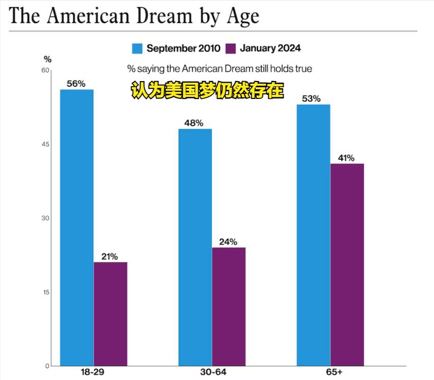 MAGA成没成还有待验证,但“美国梦”还得继续做。 “美国梦”(American Dream)这一概念由美国历史学家詹姆斯·特鲁斯洛·亚当斯(James Truslow Adams)在1931年著作《美国史诗》中首次明确提出。 当时的美国正值经济大萧条时期。而其后的罗斯福新政时期、以及里根经济复苏时代,均被视为“美国梦”的代表时代。 去年美国总统大选前,美国广播公司新闻网/益普索(ABC News/Ipsos)做了一个关于“美国梦”的民调。 只有27%的人表示美国梦仍然存在,比2010年首次提出这个问题时的50%大幅下降。表示“美国梦”从未成立的是18%,远高于曾经的 4%。 对美国梦的悲观情绪在各个群体均有增长,而这种变化在年轻人中最为明显。他们认为美国梦仍然成立的观点下降了 35 个百分点,从 2010 年的 56% 下降到现在的 21%。 去年的总统还是“瞌睡乔”,他不仅没有挽救“美国梦”,倒是自己昏昏欲睡了,结果稀里糊涂的退出了竞选。 美国现在正值“懂王时代”。特朗普在3月的国会联席会议上发表演讲时,提出了“重振美国梦”的口号。自他再次上台已过去了280天。“美国梦”是越来越多了还是越来越少,是“美梦”还是变“噩梦”了呢?