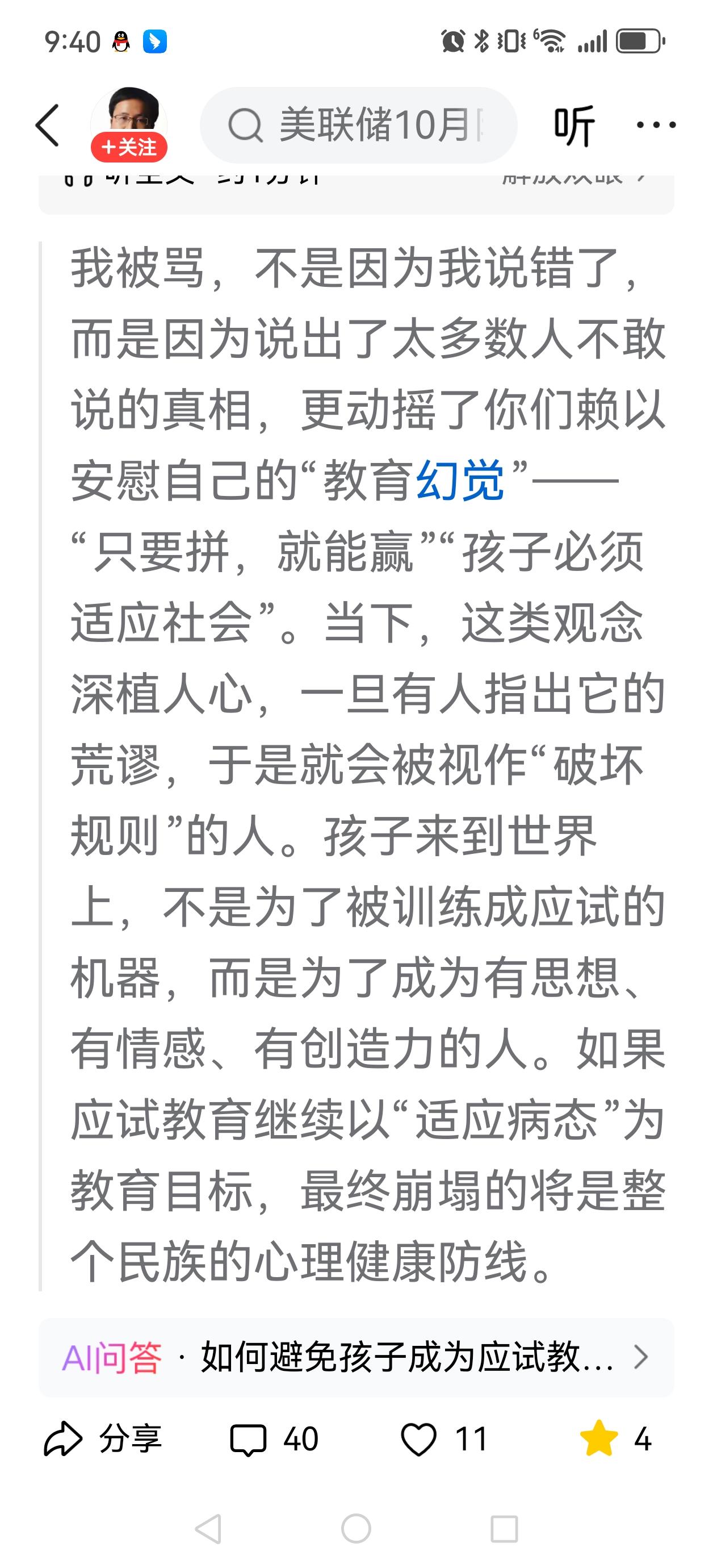 家长的这种思维会给孩子带来什么? 非常不认同这位宋学者有关教育的论调,但平时也很少去反驳他,一来确实也同情他的际遇,二来也真的反感他甩锅思维。 但这一次真的不吐不快!因为我发现,家长的家教思维对孩子的影响太重要了! 我们来看看他给孩子传导的是什么思维:面对“赢”,他的思维是“只要拼,就能赢”,但是当孩子在拼了一把却没有达到预期的“赢”时,他会是多么地怀疑甚至绝望啊!而且这句话给孩子下达的就是只有“赢”的选项,别无其他选择。 但是聪明的家长他会告诉孩子:“想要赢,就得拼”即正确地表达了“拼”和“赢”的关系,也让孩子有了“不赢”和“赢”的选择,也给孩子在“不赢”之后留下了反思的空间。 “只要拼,就能赢”“想要赢,就得拼”,如果是你,你更喜欢接受哪一句话呢? 再来看看面对“社会”的思维,他要求孩子“必须适应社会”,且不说“必须”一词多么的冷酷无情,“适应”一词,是以社会为中心的,社会比孩子更重要,这会让孩子感到多么的被动与无助。 聪明的家长肯定不会这么对待自己的孩子的。他们会对孩子说:“孩子要学会融入社会”,这让孩子在社会面前掌握了主动性。 两相比较,其实表达的意思差不多,但教育的思维却大相径庭,前者是冷冰冰的策动,后者是充满温情的鼓励,体现的是你是否真的“以孩子为中心”“从孩子的感受出发”。 家庭本来就是孩子最温暖的港湾,当孩子在外面受委屈受伤害的时候却不想回家躲避,那么这个港湾是绝对有问题的。 不可否认,当下的教育考试机制,确实存在着这样那样的问题。但又必须承认现在的教育考试制度,却又是对千万普通人家的学子们最公平公正的人才选拔机制。面对问题,我们应该是共同反思探讨,革弊鼎新,而不是全盘否定,想推倒重来。 不用现在的考试机制,难道要用世袭制?举荐制?还是捐纳制? 其心叵测啊! 家庭教育 畅谈家庭教育 家长沟通误区 父辈的教育观 家长教育方式 家长教育观念 家长不能被裹挟 教育观对比 家长思维模式