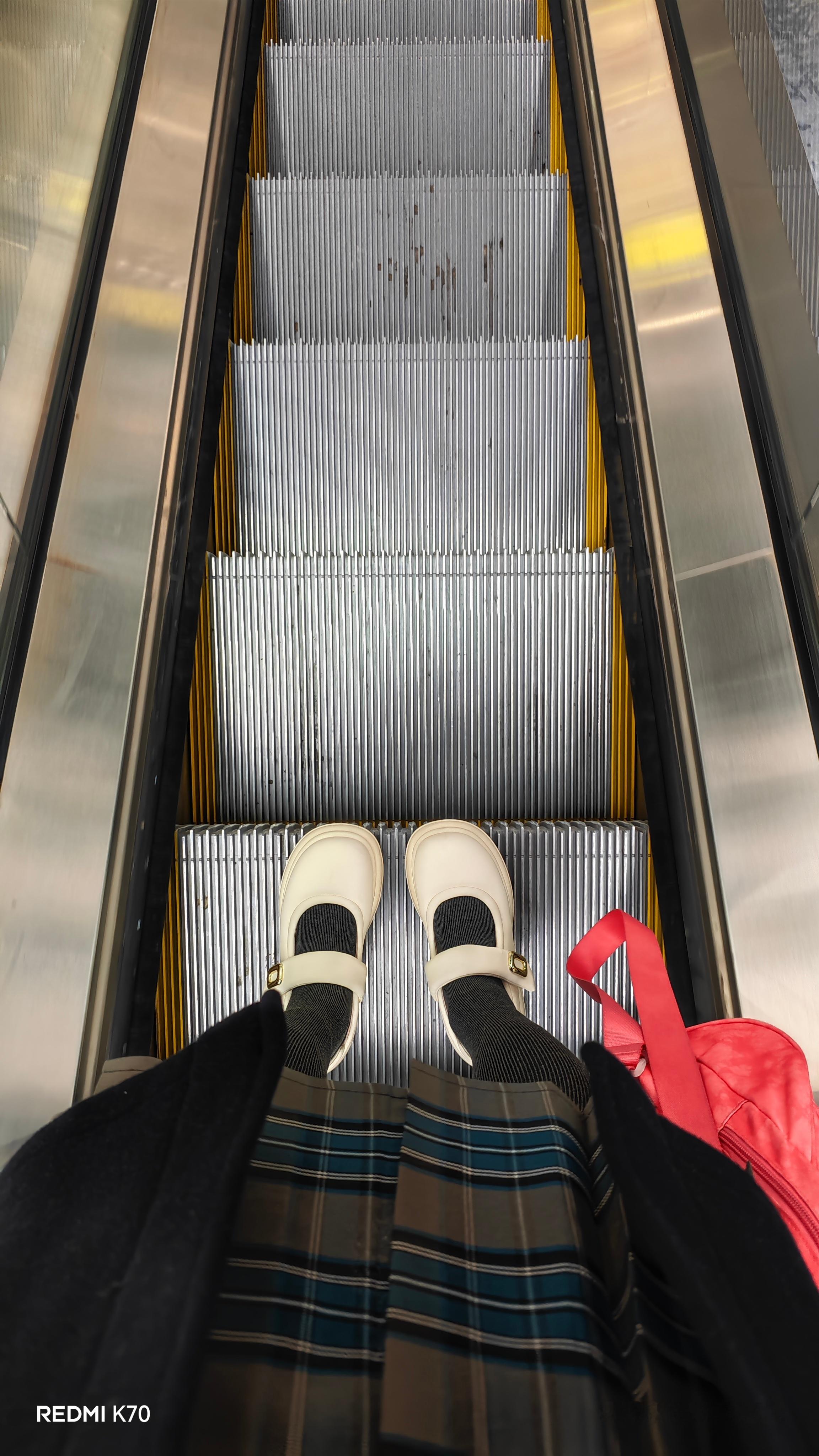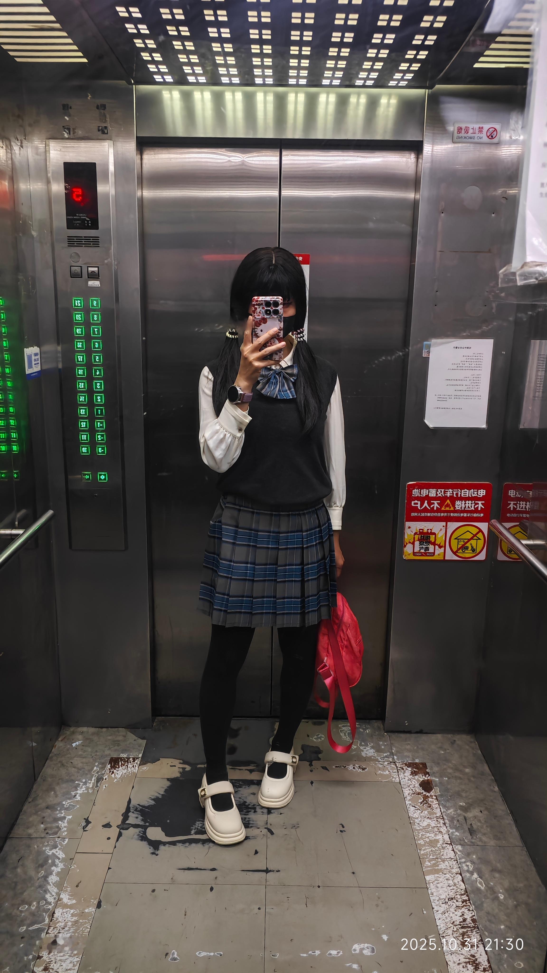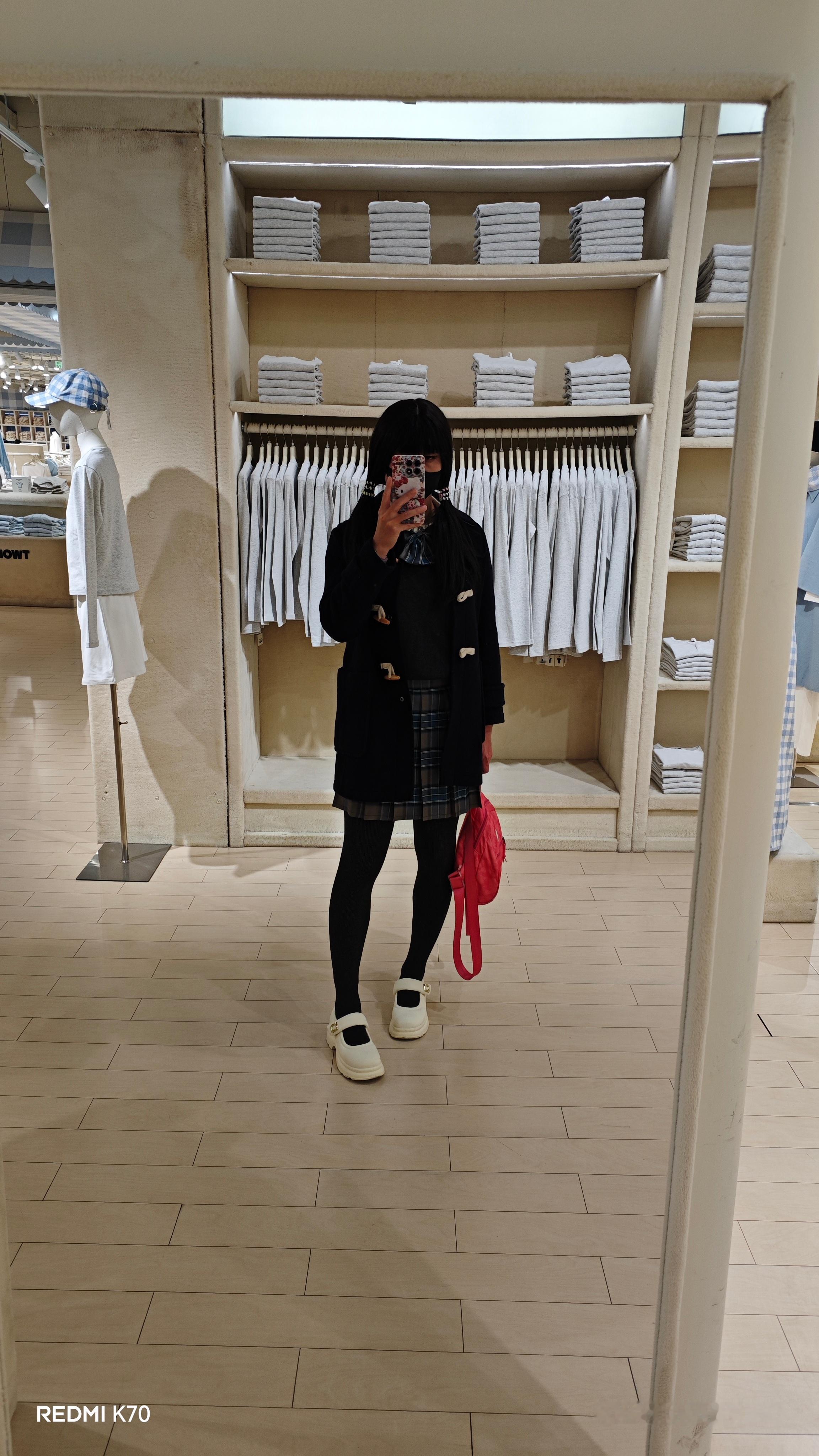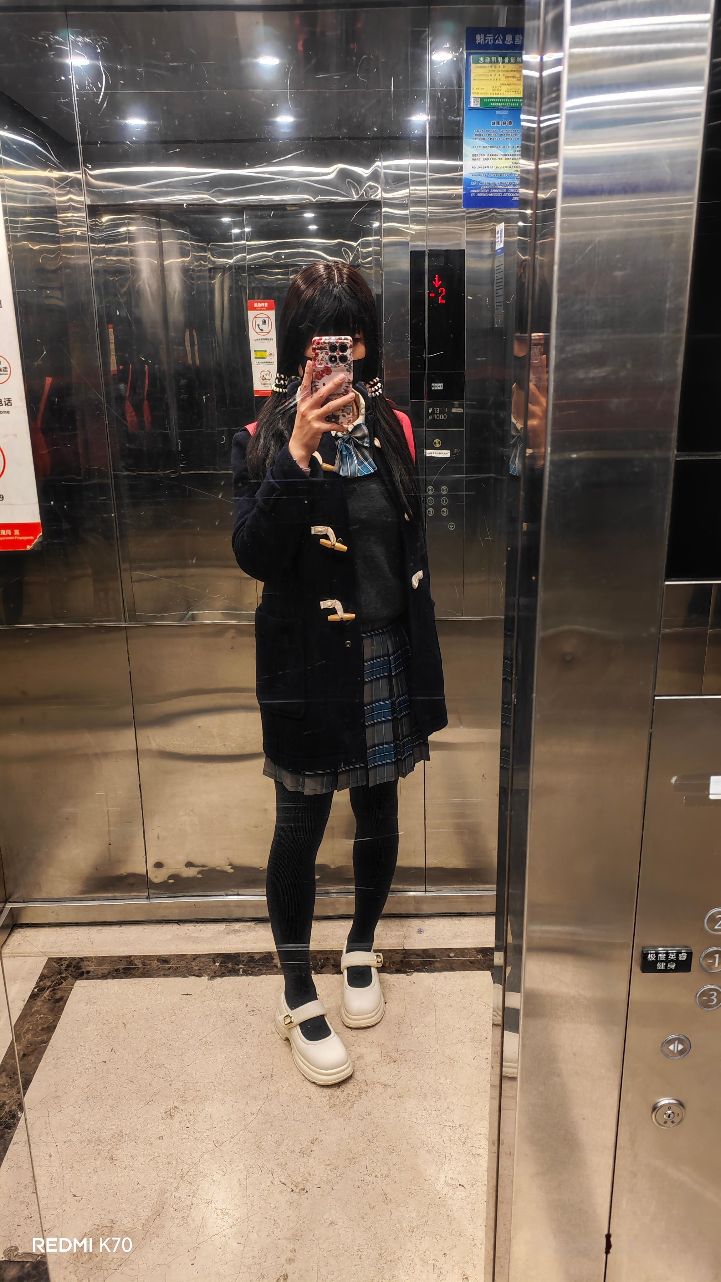 今天穿得米色衬衫,JK裙叫青碧,灰色的马甲,灰色加绒打底裤,小白鞋,外面仍旧是毛呢大衣。 ​​​